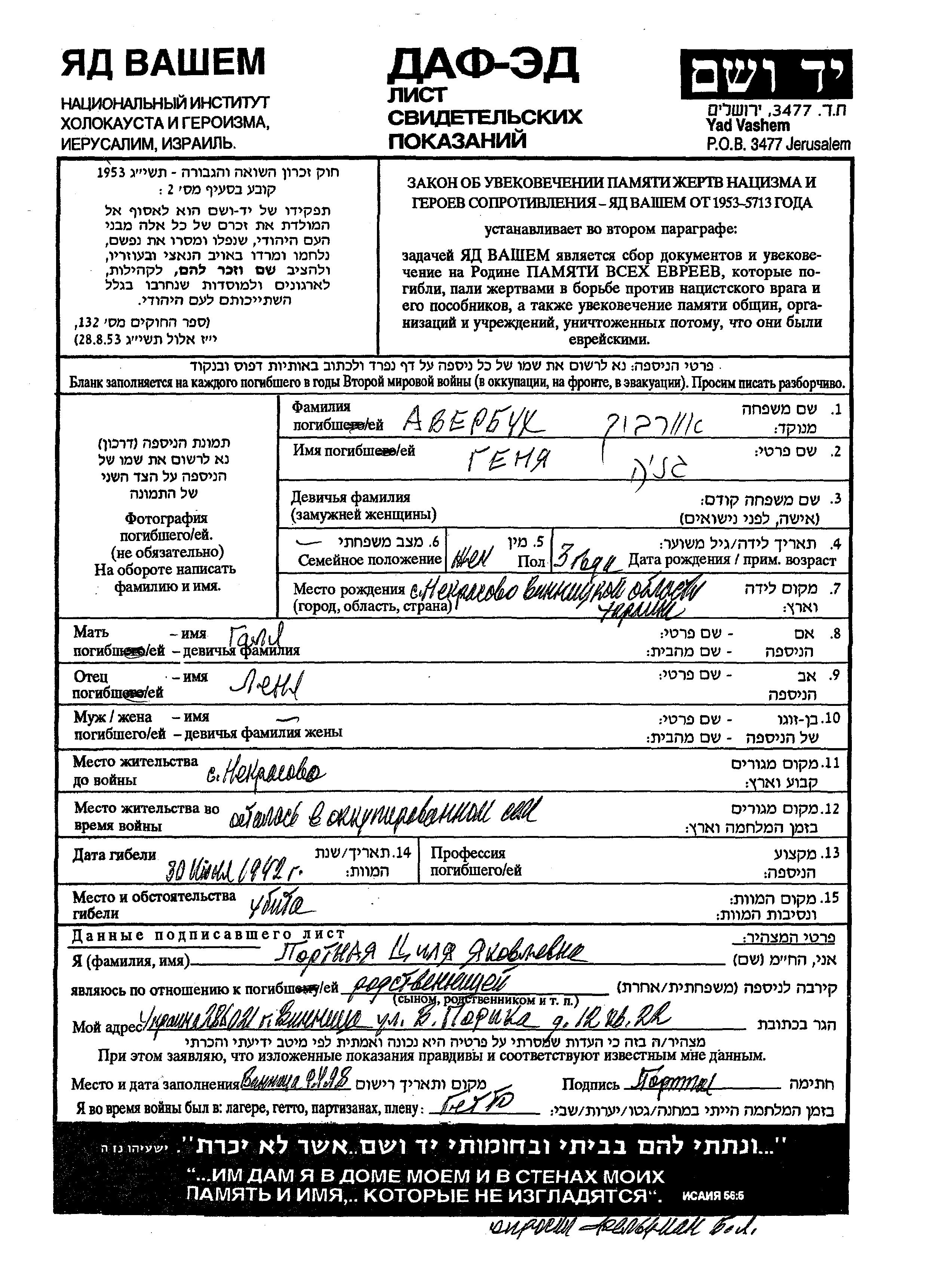Genya Averbukh was born in Nekrasovo, Ukraine (USSR) to Lyonya and Galya. Prior to WWII she lived in Nekrasovo, Ukraine (USSR). During the war she was in Nekrasovo, Ukraine (USSR). Genya was murdered in the Shoah. Place of death: unknown, 30/06/1942.