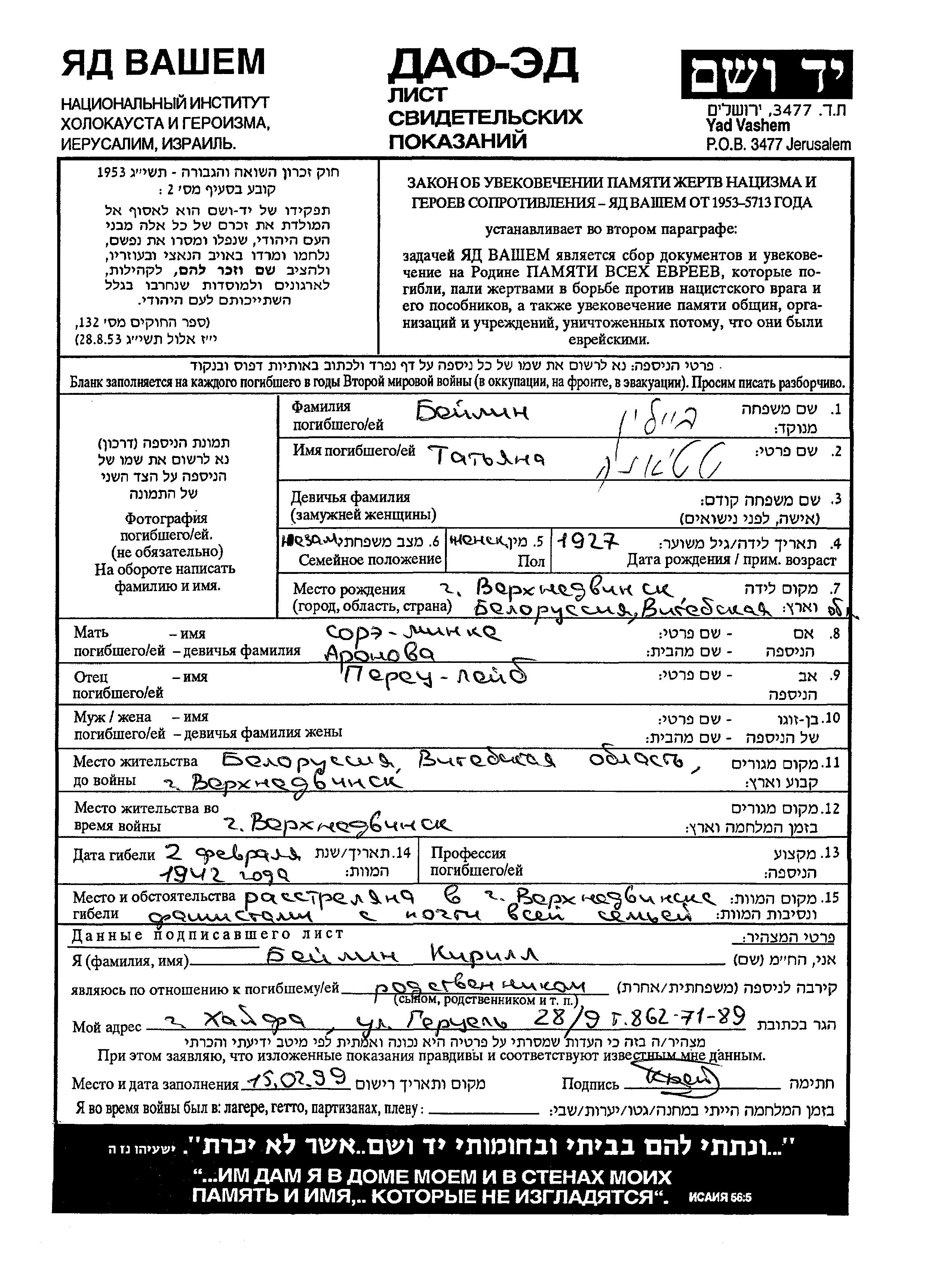 Beilin Tatiana 1927 Verkhnedvinsk, Belorussia (USSR) Page of Testimony