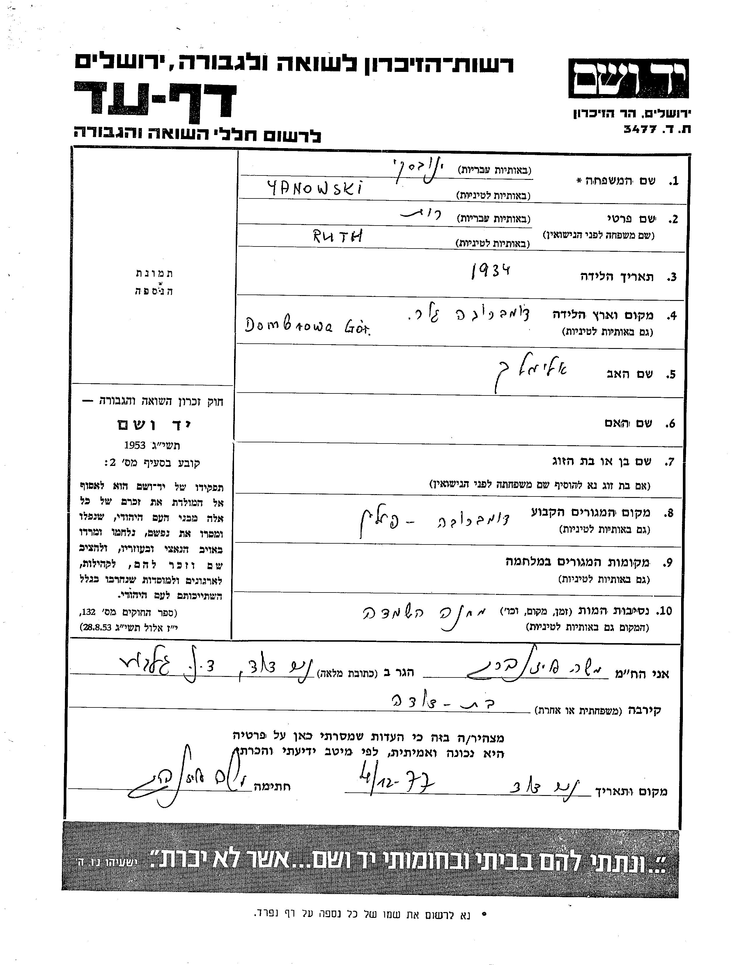 Yanowski Ruth 1934 Dąbrowa, Poland Page of Testimony