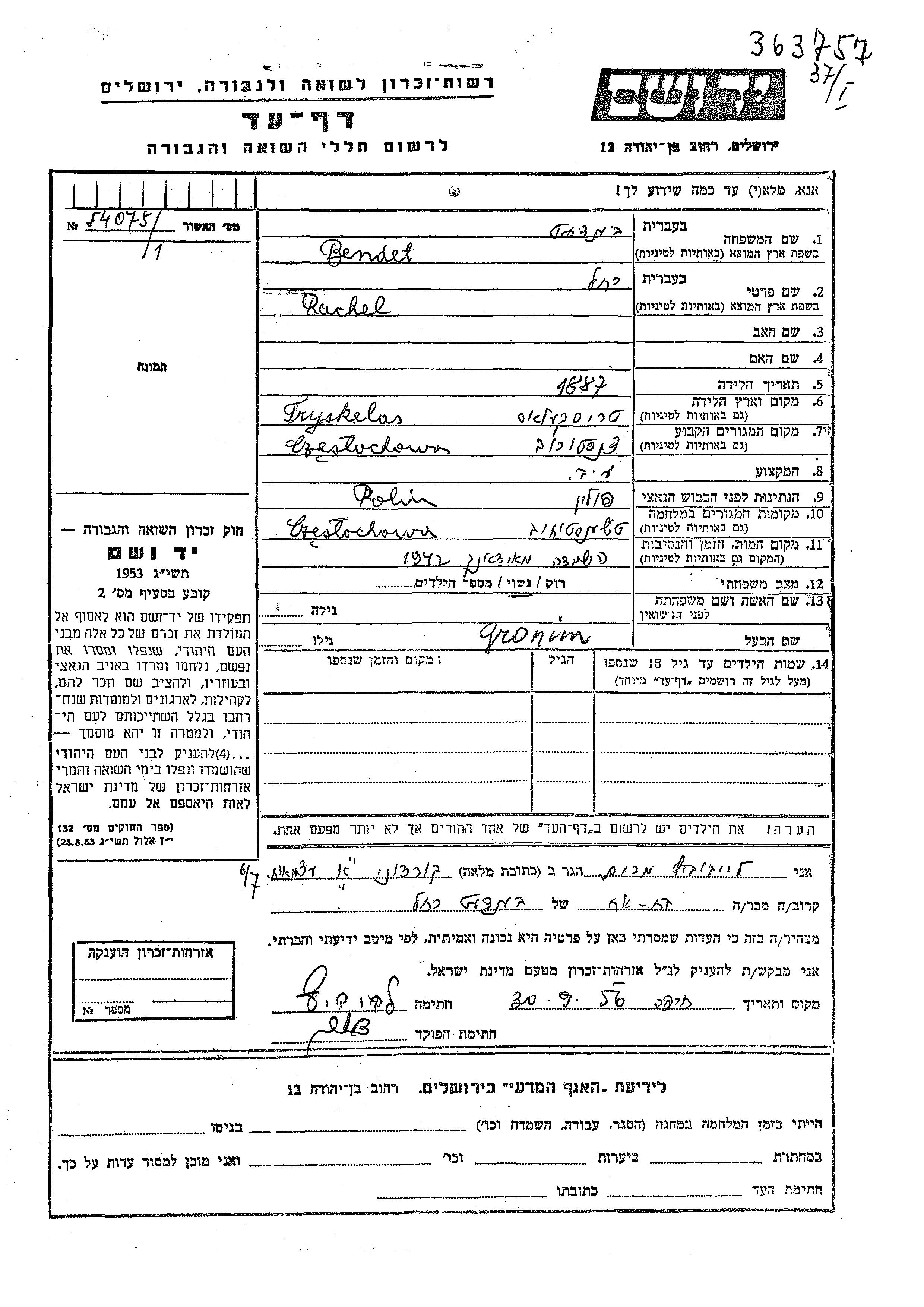 Rachel Bendel Bendet was born in Truskolasy, Poland, 1887. She was a housewife and married to Gronim. Prior to WWII she lived in Czestochowa, Poland. During the war she was in Czestochowa, Poland. Rachel was murdered in the Shoah. Place of death: Majdanek, Poland, 1942.