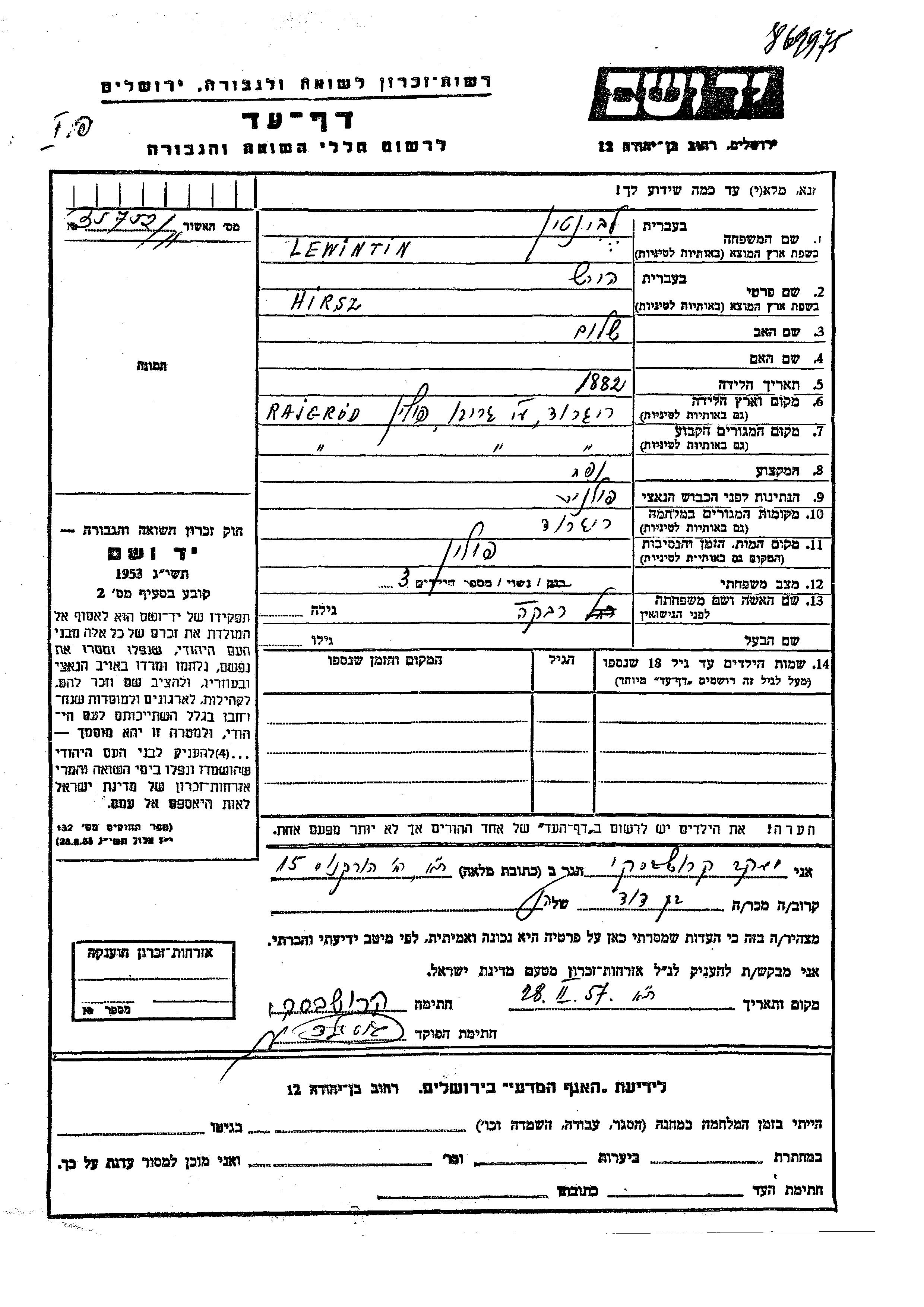Hirsz Lewintin was born in Rajgrod, Poland, 1882 to Shalom. He was a blacksmith and married to Rivka. Prior to WWII he lived in Rajgrod, Poland. During the war he was in Rajgrod, Poland. Hirsz was murdered in the Shoah. Place of death: Poland.