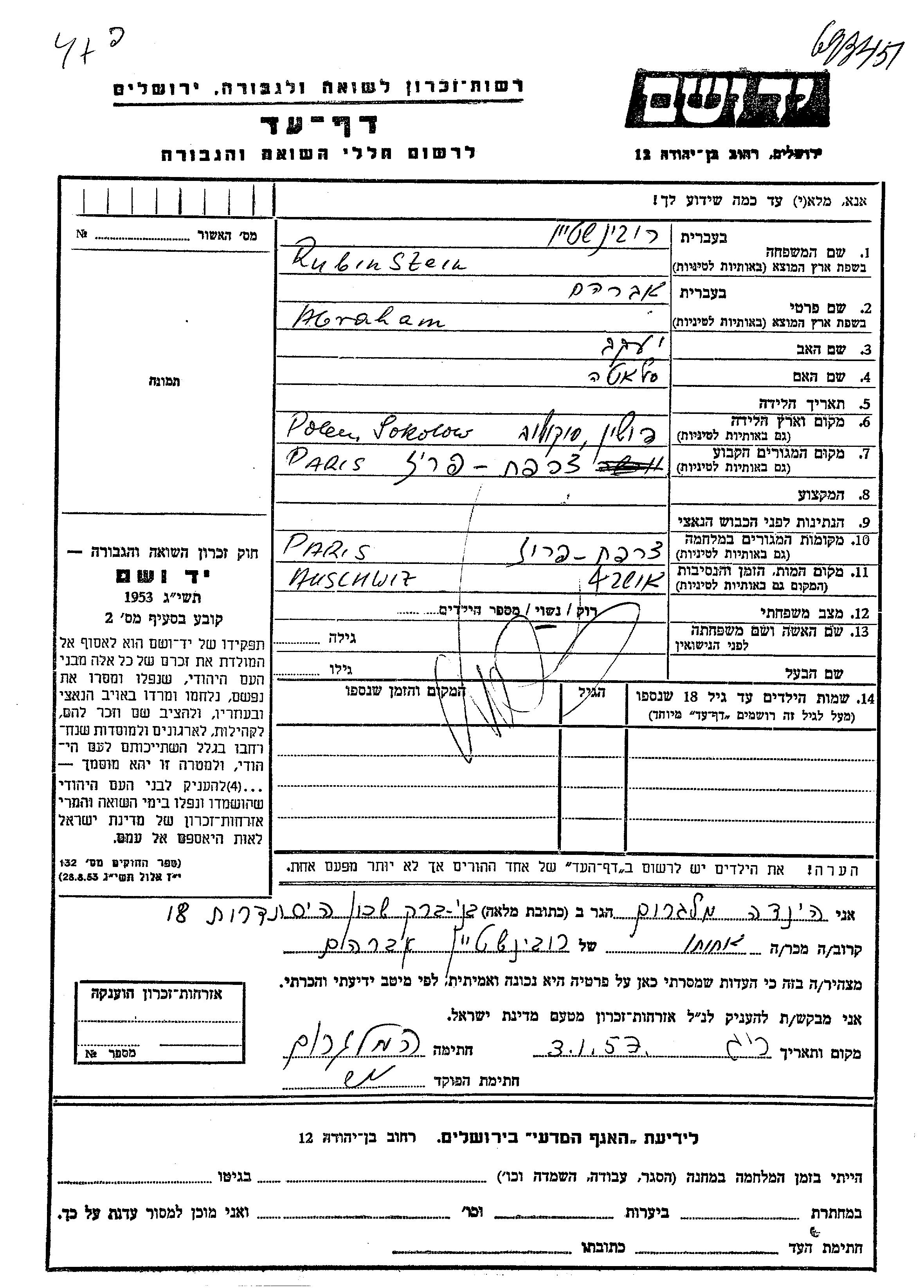 Abraham Rubinstein was born in Sokolow, Poland to Yaakov and Slata. He was married. Prior to WWII he lived in Paris, France. During the war he was in Paris, France.