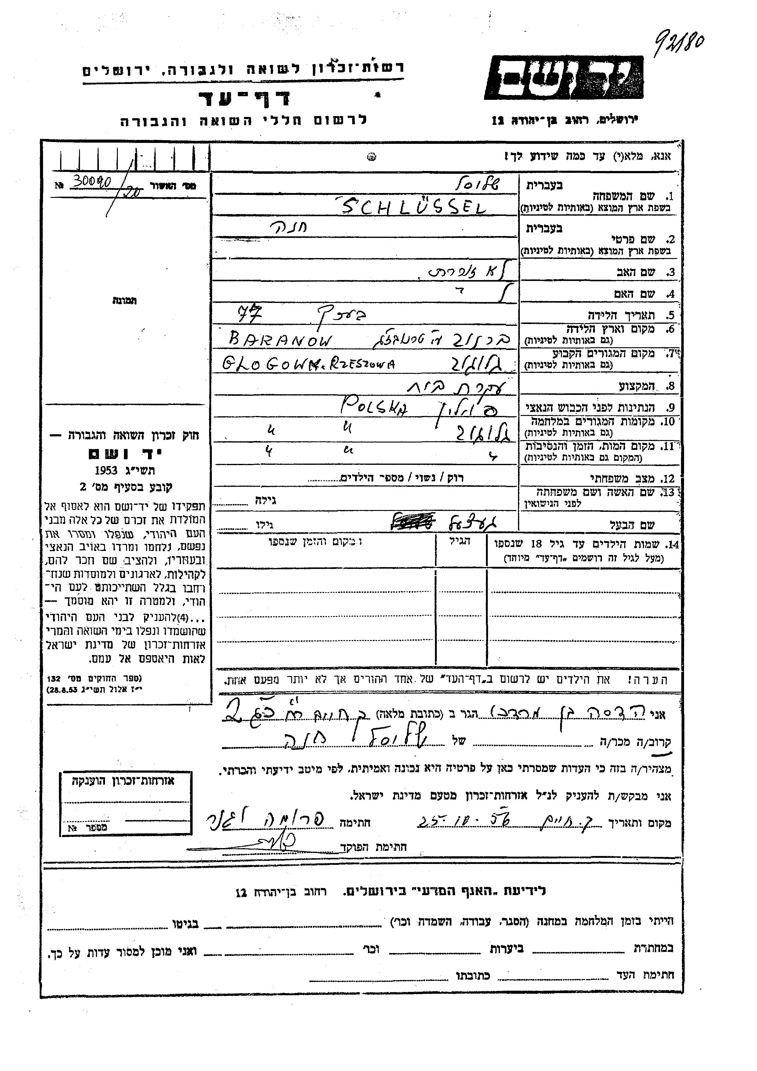 Schlussel Khana Glogo, Poland Page of Testimony