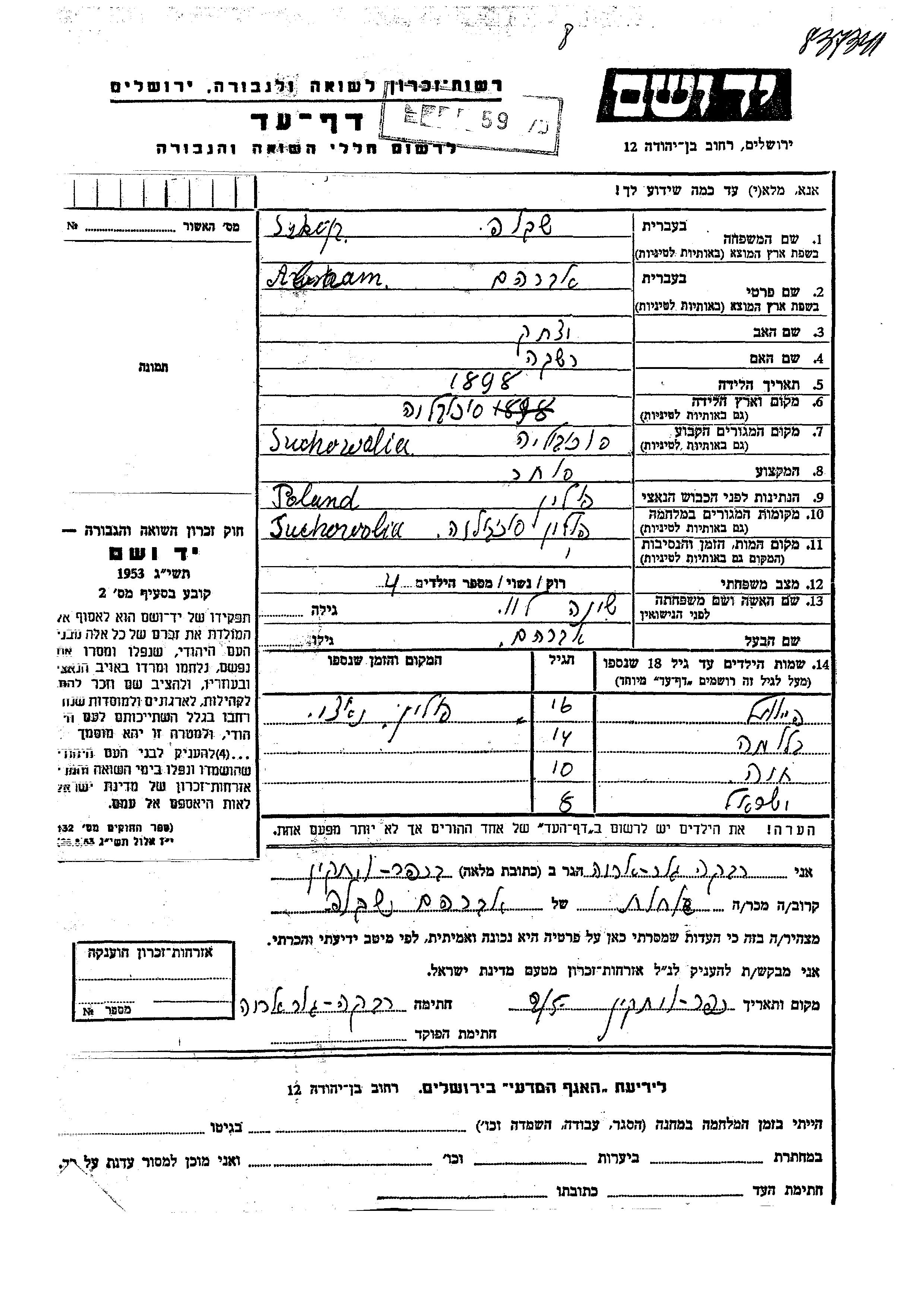 Abraam Szkop was born in Suchowola, Poland, 1898 to Yitzkhak and Rashka. He was a merchant and married to Sheina nee Lev. Prior to WWII he lived in Suchowola, Poland. During the war he was in Suchowola, Poland. Abraam was murdered in the Shoah.