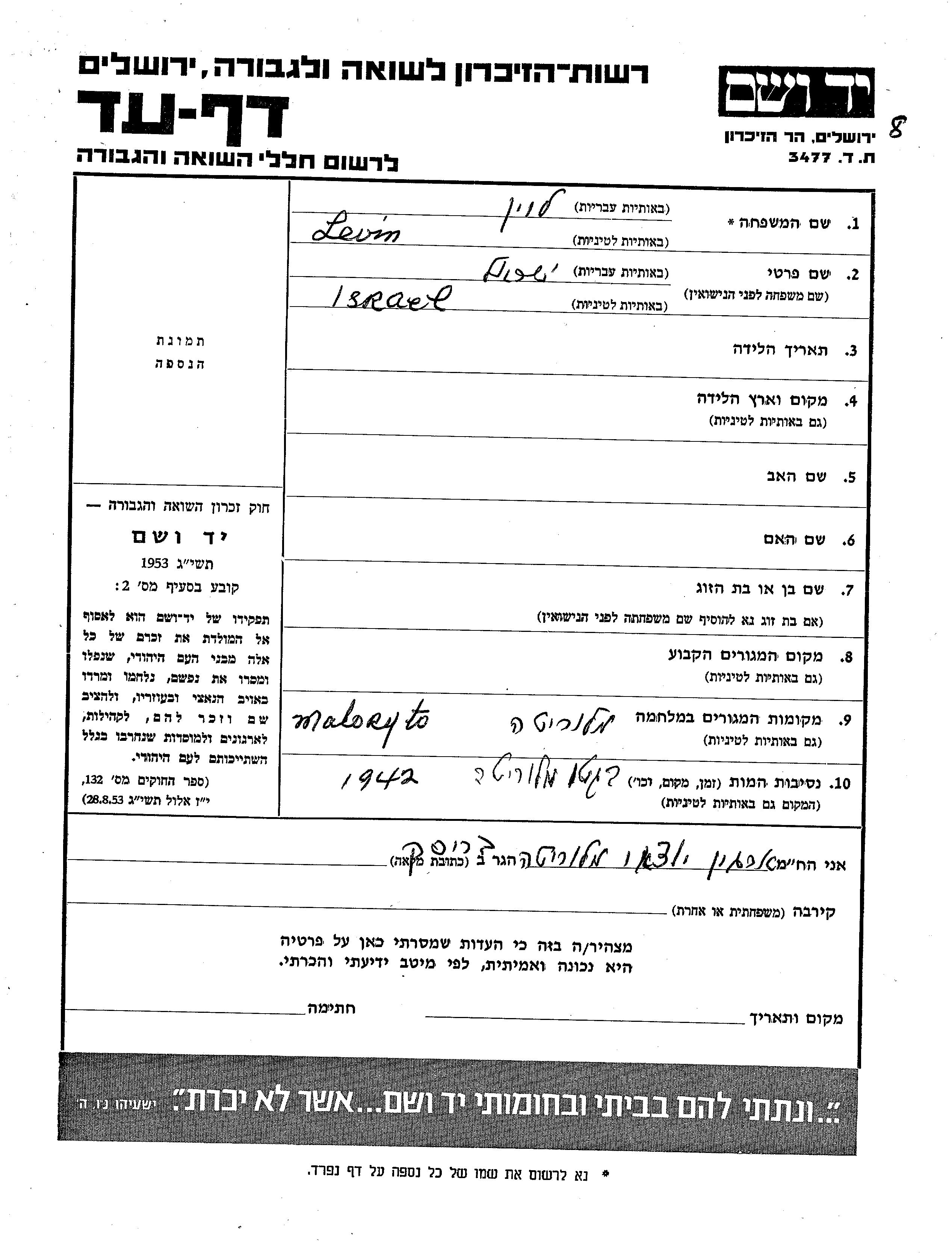 Israel was murdered in the Shoah. Place of death: Maloryta, Poland, 1942.