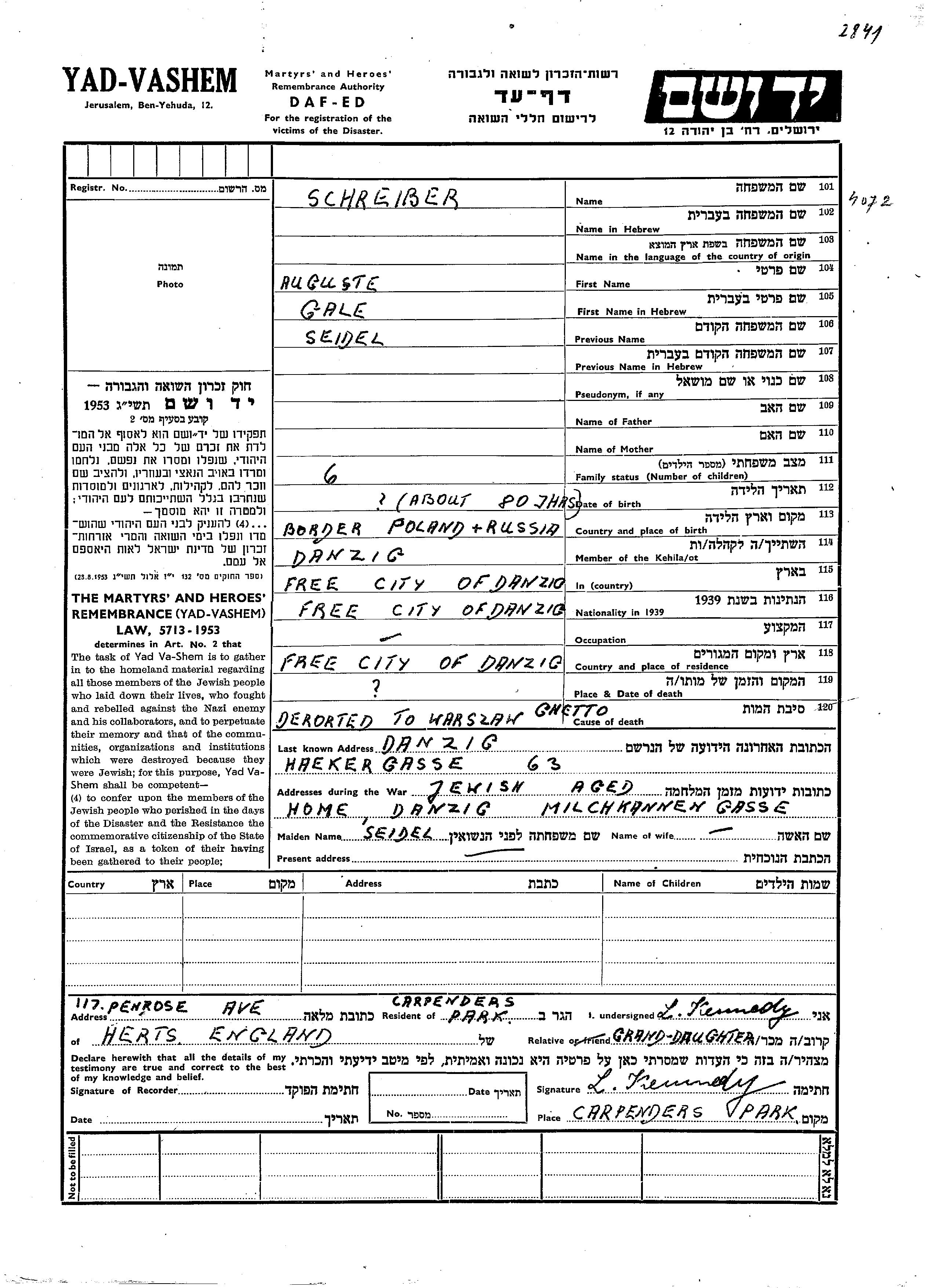 Auguste Gale Schreiber nee Seidel was born in Border Russia. She was married. Prior to WWII she lived in Danzig, Free City of Danzig. During the war she was in Danzig, Free City of Danzig. Auguste Gale was murdered in the Shoah. Place of death: Warszawa, Poland.
