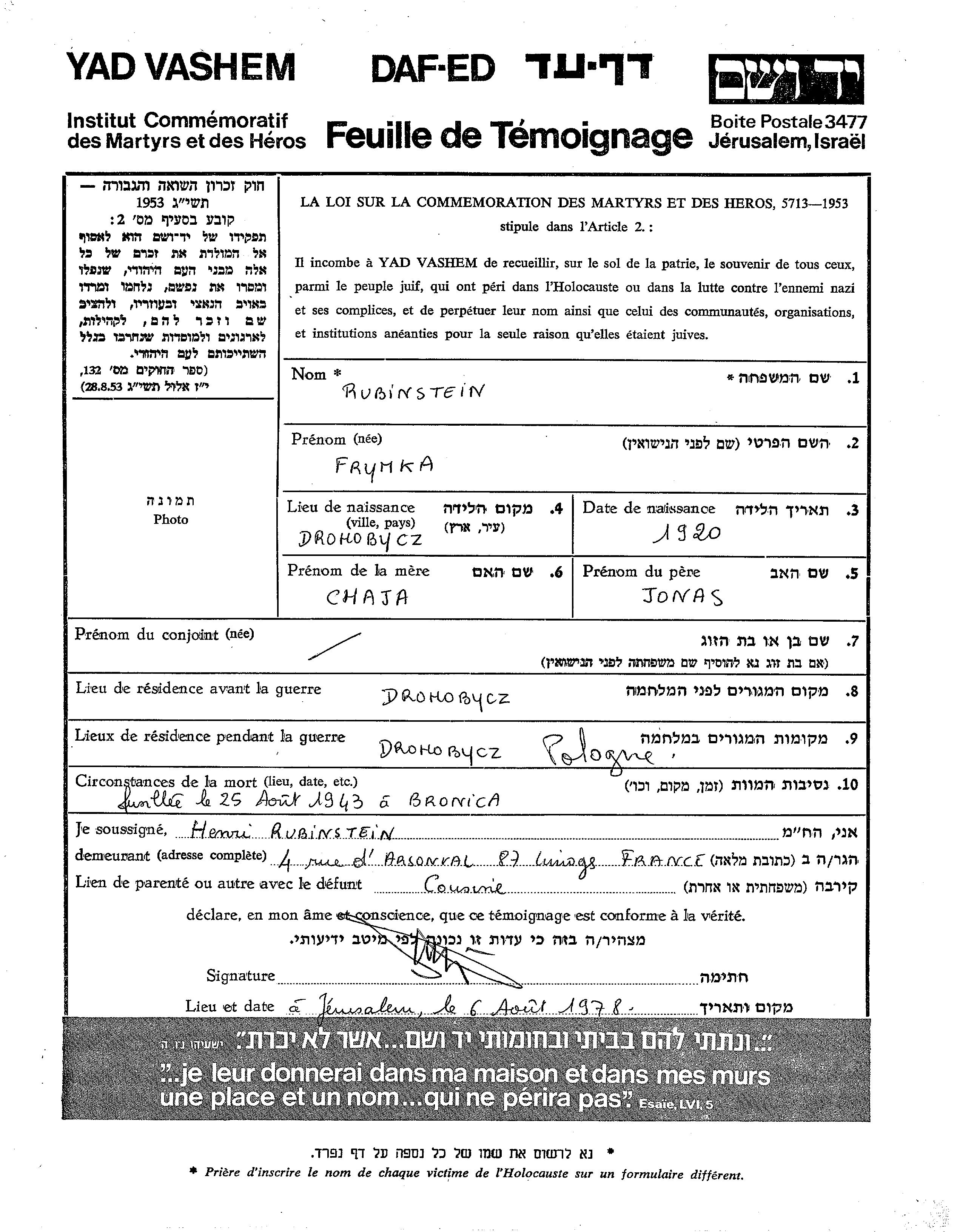 Rubinstein Frymka 1920 Drohobycz, Poland Page of Testimony