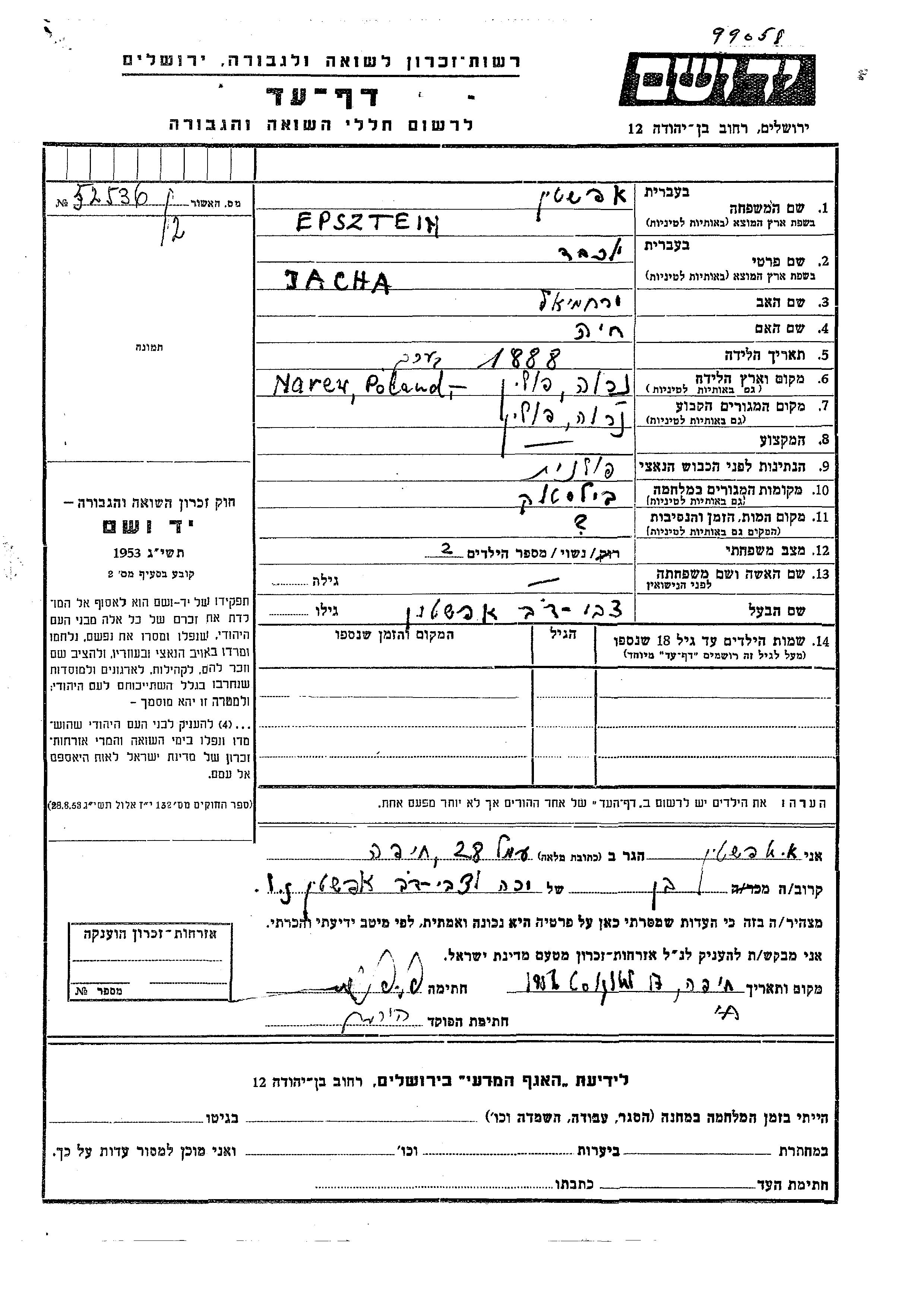 Jacha Epsztein was born in Narew, Poland, 1888 to Yerakhmiel and Khaia. She was married to Tzvi Dov. Prior to WWII she lived in Narew, Poland. During the war she was in Bialystok, Poland. Jacha was murdered in the Shoah.