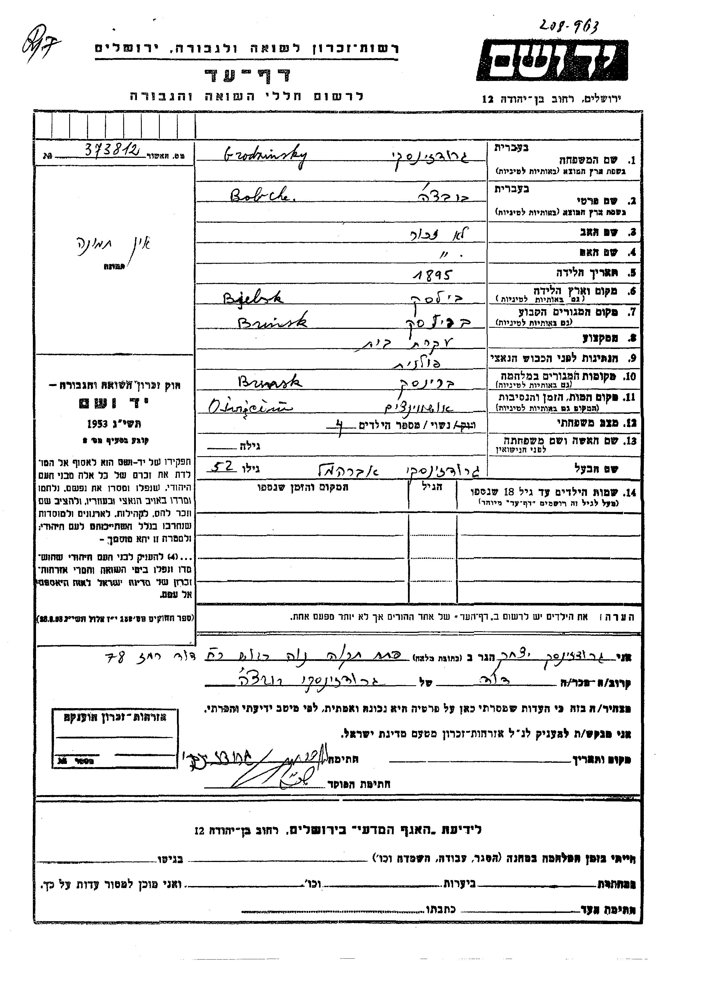 Bobche Grodzinsky was born in Bielsk, Poland, 1895. She was a housewife and married to Avremel. Prior to WWII she lived in Bielsk, Poland. During the war she was in Bielsk, Poland. Bobche was murdered in the Shoah. Place of death: Auschwitz, Poland.