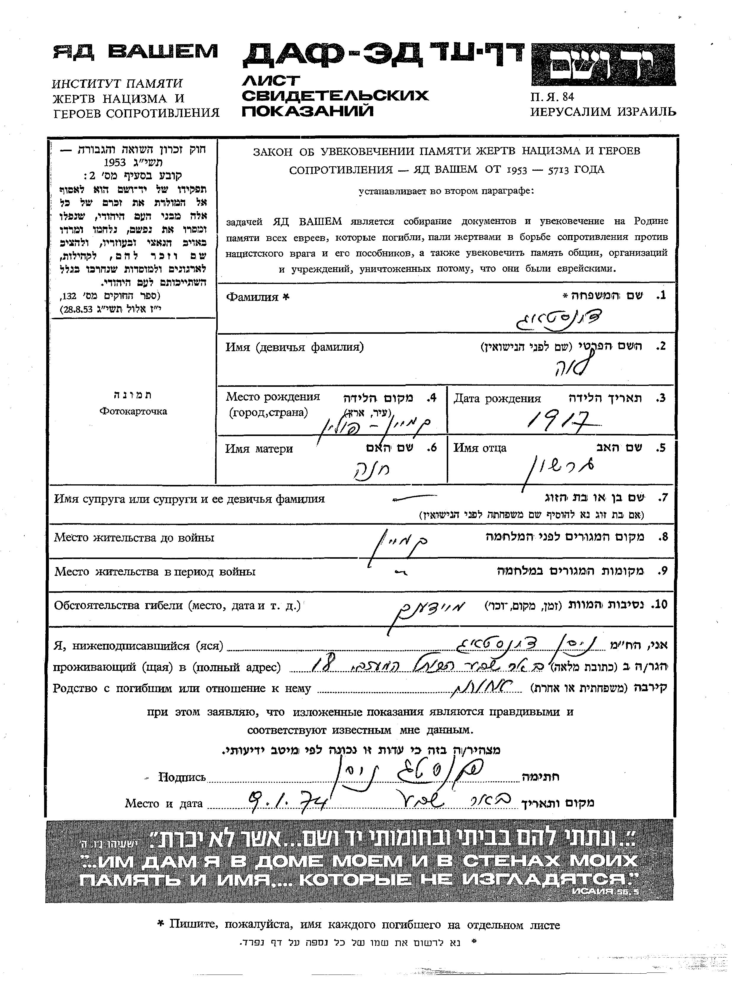Lea Dinstag was born in Kamien, Poland, 1917 to Gershon and Khana. She was single. Prior to WWII she lived in Kamien, Poland. During the war she was in Kamien, Poland. Lea was murdered in the Shoah. Place of death: Majdanek, Poland.
