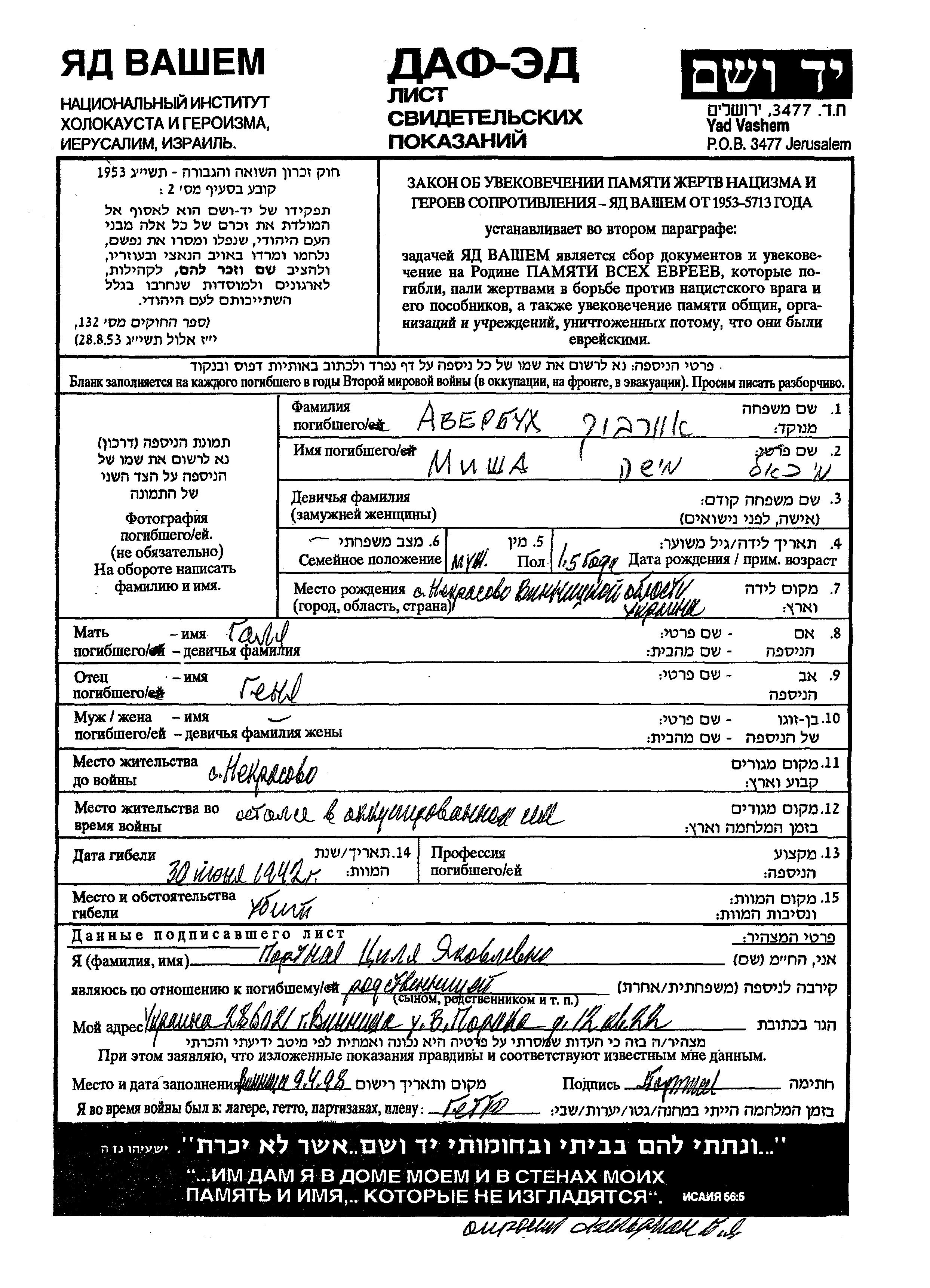 Misha Averbukh was born in Nekrasovo, Ukraine (USSR) to Gena and Galya. Prior to WWII he lived in Nekrasovo, Ukraine (USSR). During the war he was in Nekrasovo, Ukraine (USSR). Misha was murdered in the Shoah. Place of death: unknown, 30/06/1942.