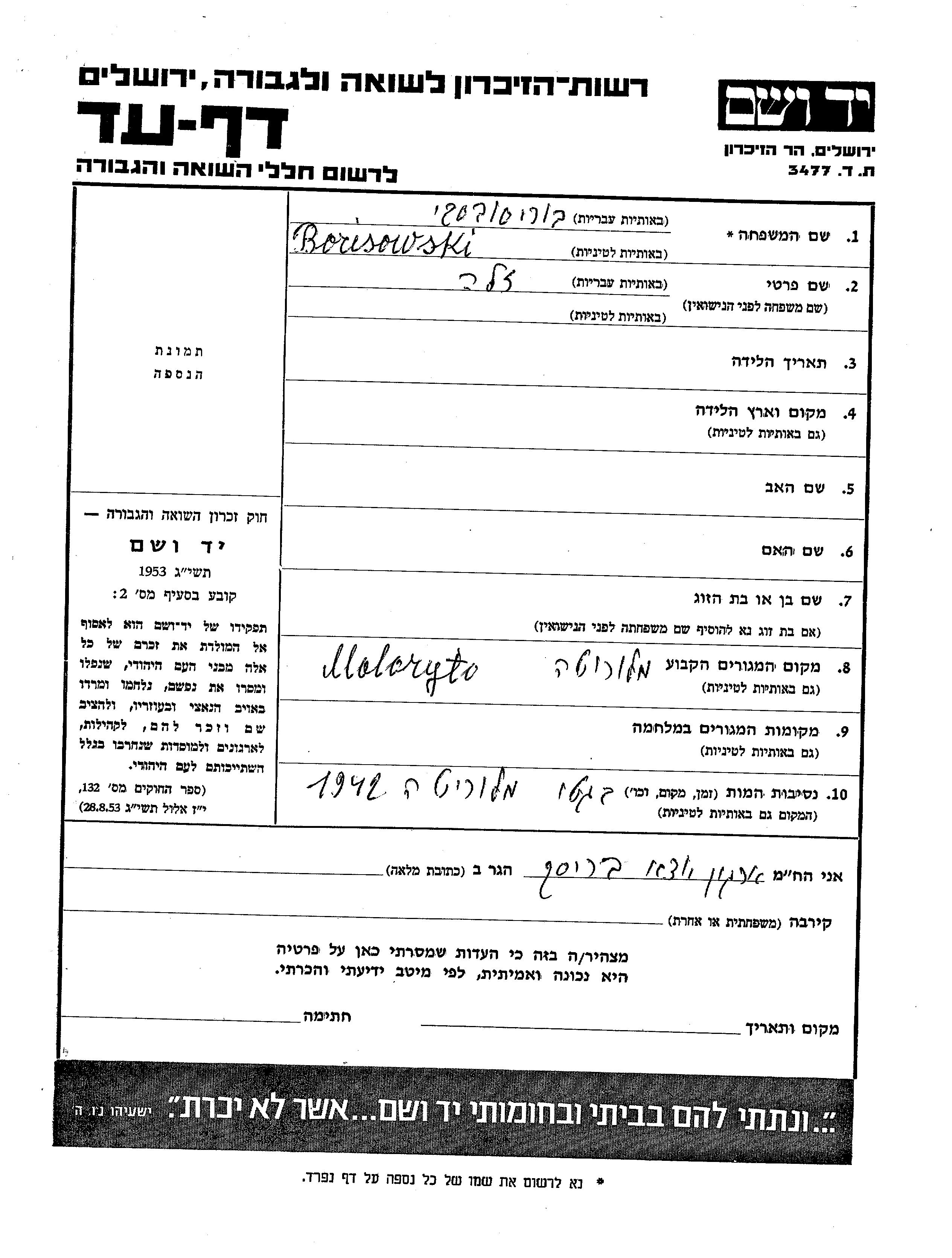 Borisowski Zala Maloryta, Poland Page of Testimony