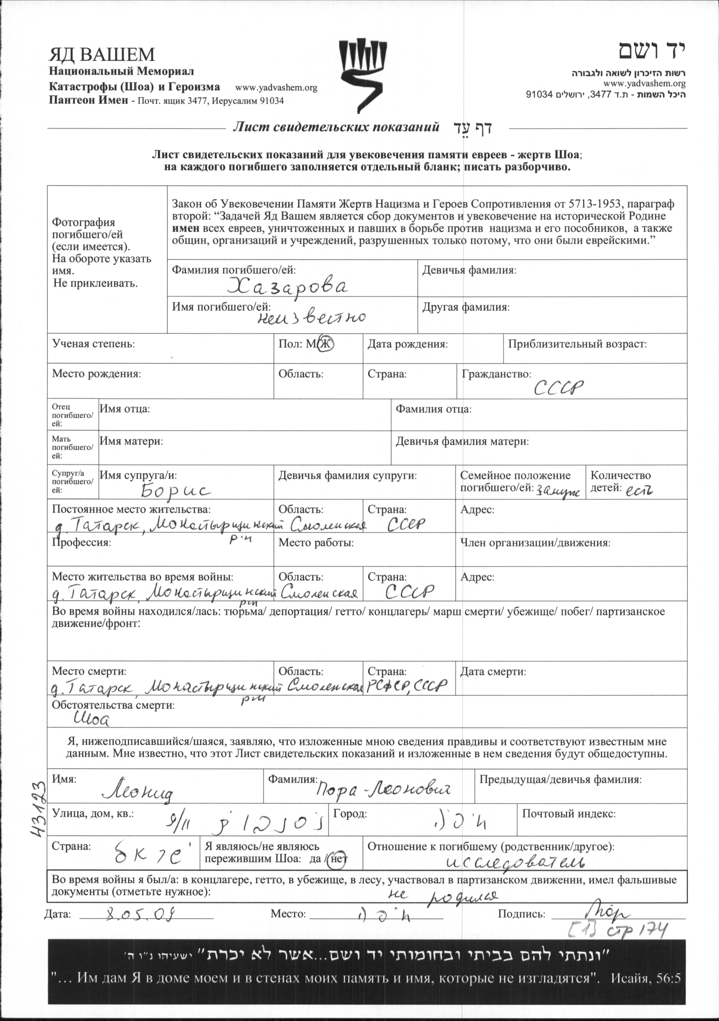 First name unknown Khazarova. She was married to Boris. Prior to WWII she lived in Tatarsk, Russia (USSR). During the war she was in Tatarsk, Russia (USSR). She was murdered in the Shoah. Place of death: Tatarsk, Russia (USSR).