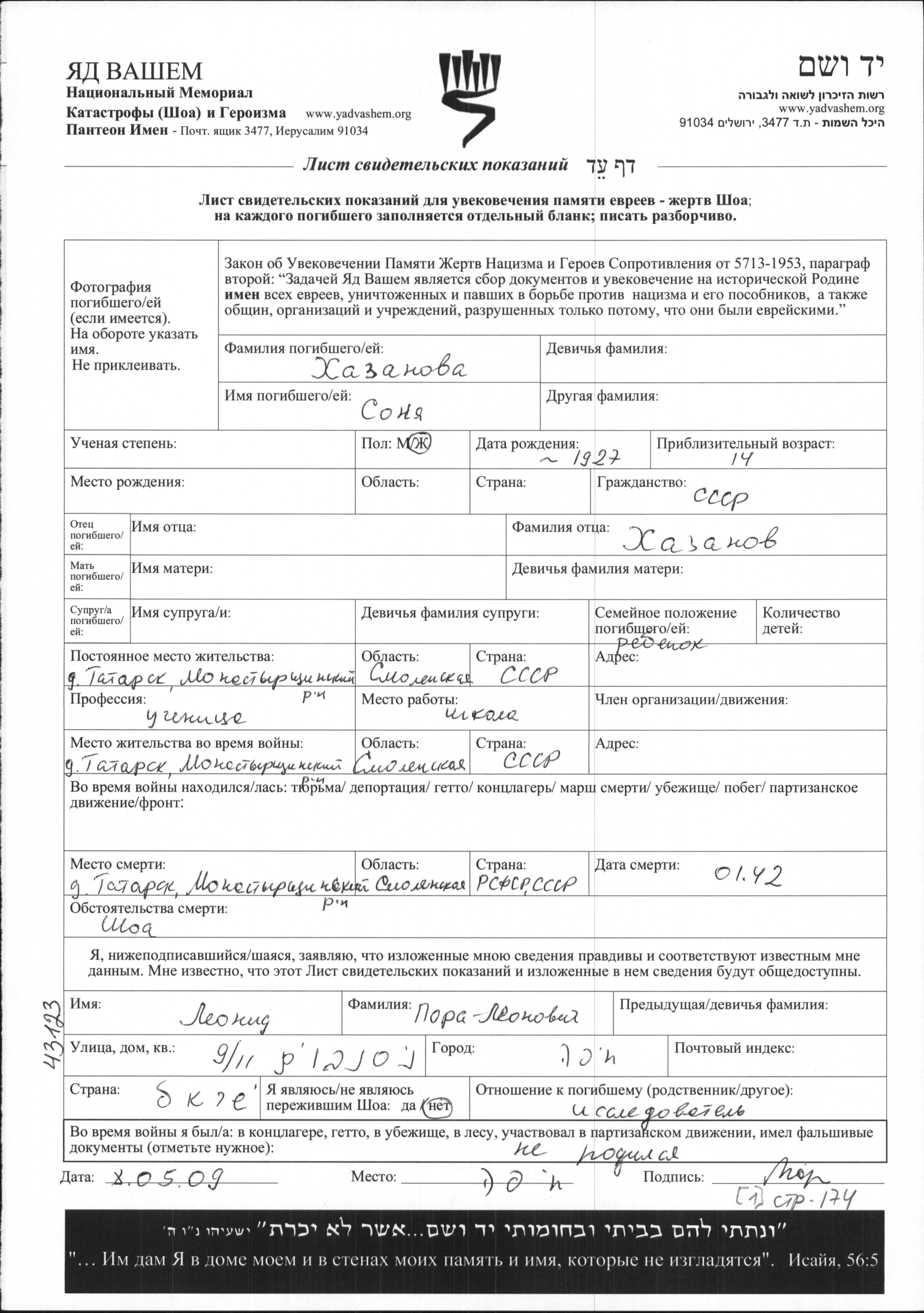 Khazanova Sonya 1927 Tatarsk, Russia (USSR) Page of Testimony