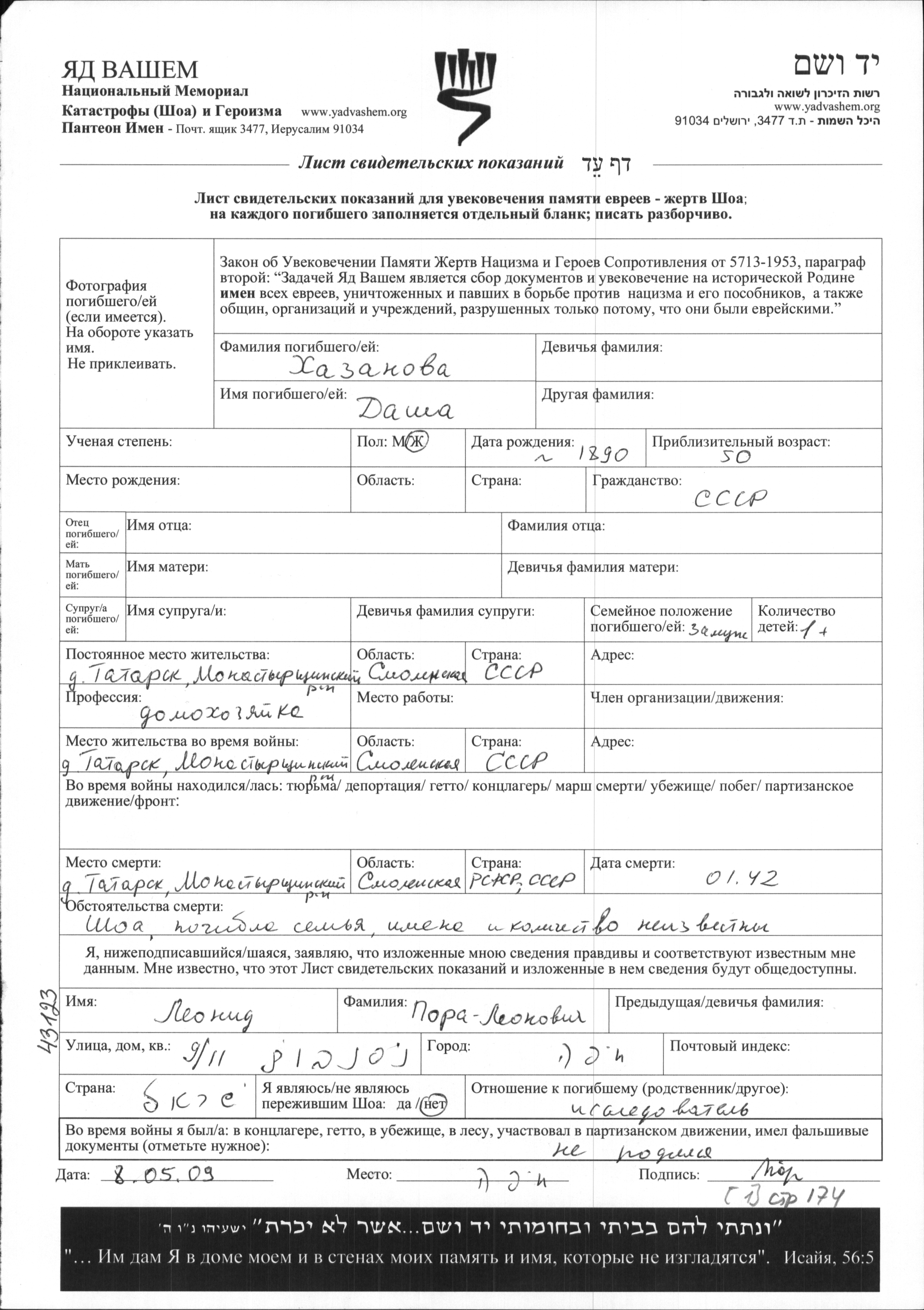 Dasha Khazanova was born, 1890. She was a housewife and married. Prior to WWII she lived in Tatarsk, Russia (USSR). During the war she was in Tatarsk, Russia (USSR). Dasha was murdered in the Shoah. Place of death: Tatarsk, Russia (USSR), 01/1942.