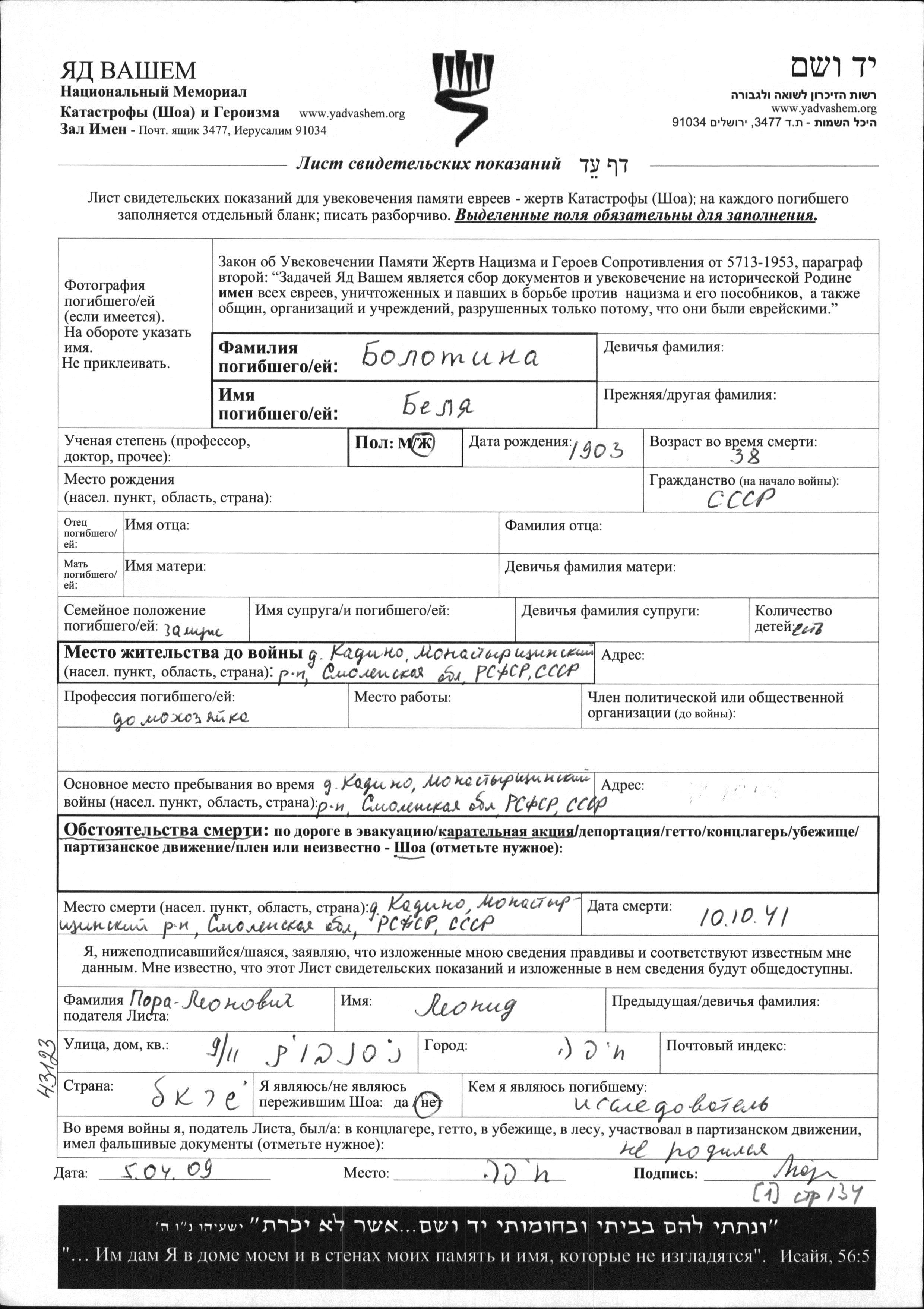 Bolotina Belya 1903 Kadino, Russia (USSR) Page of Testimony