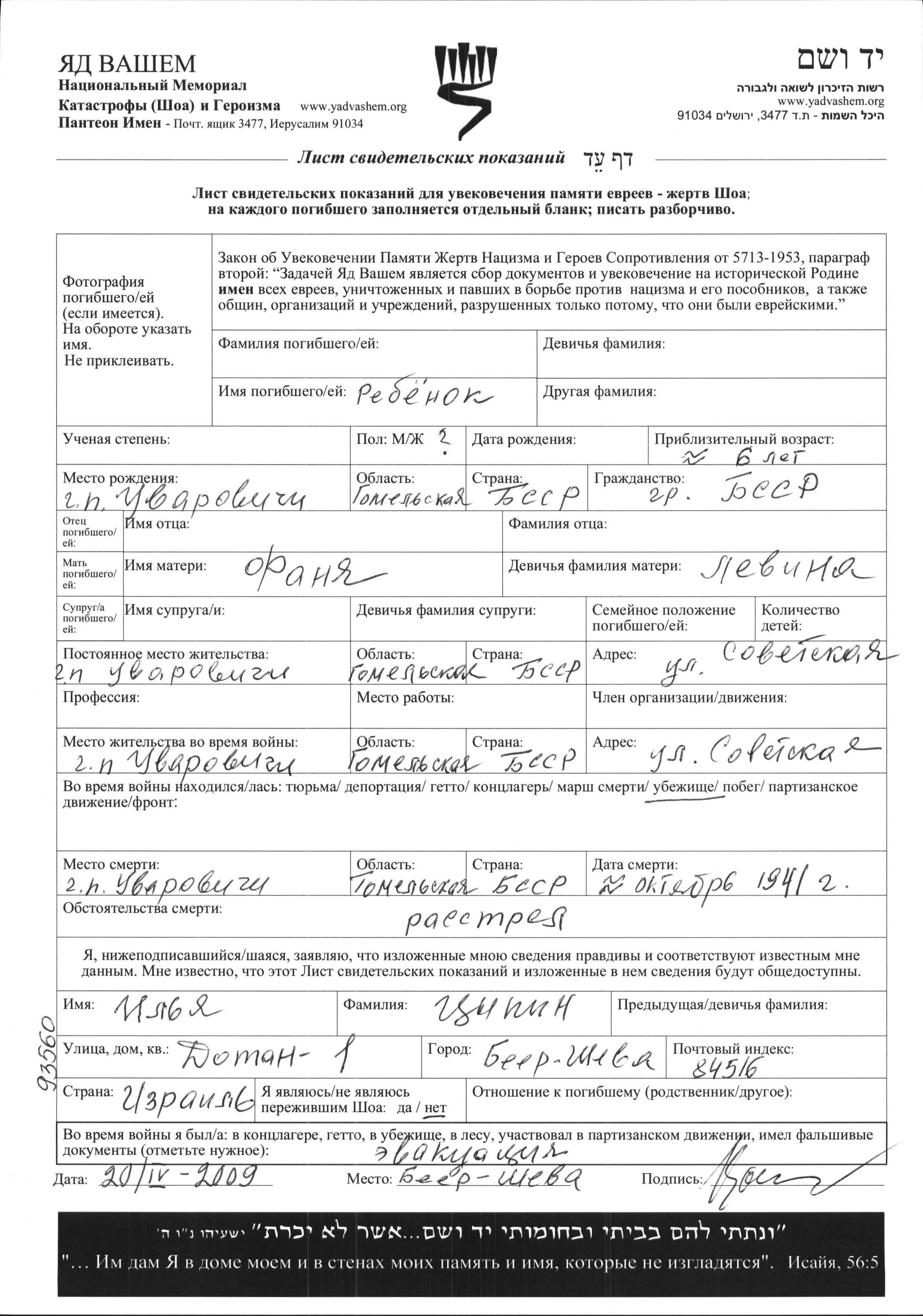 Surname unknown First name unknown Uvarovichi, Belorussia (USSR) Page of Testimony