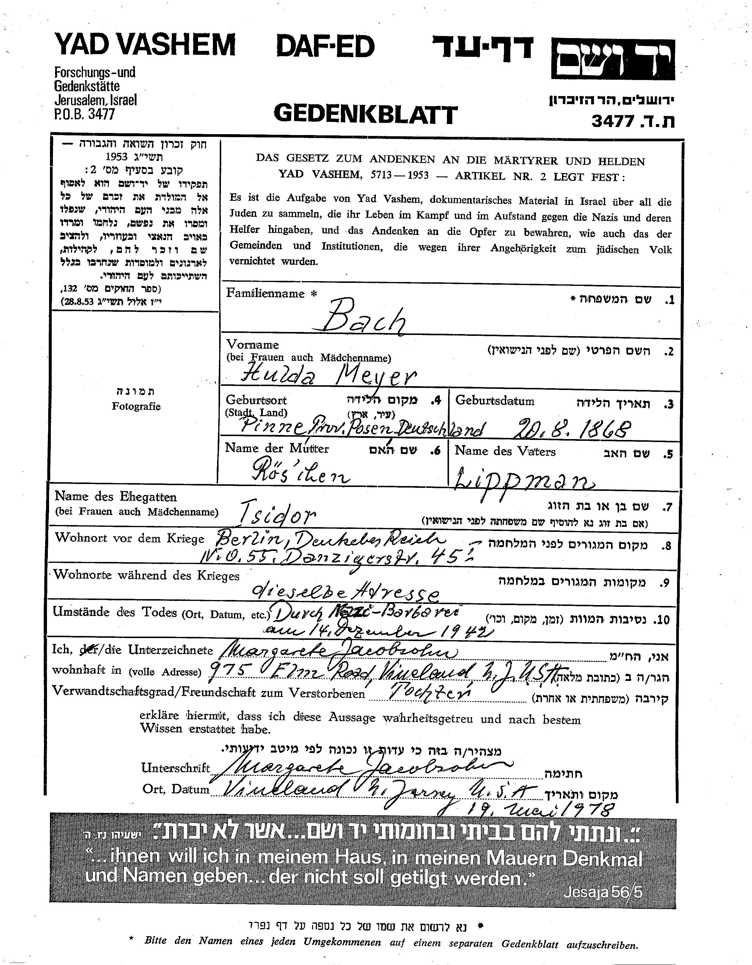 Hulda Bach nee Meyer was born in Pinne, Poland, 1868 to Lippman and Roeschen. She was married to Isidor. Prior to WWII she lived in Berlin, Germany. During the war she was in Berlin, Germany. Hulda was murdered in the Shoah. Place of death: unknown, 14/12/1942.