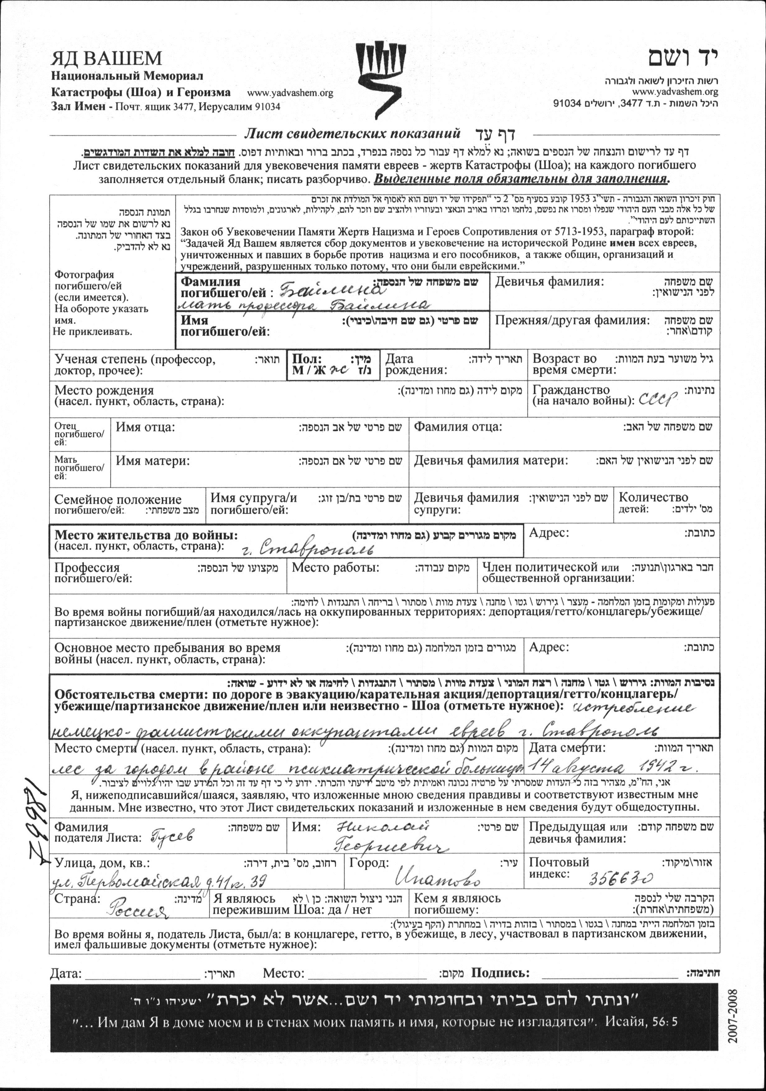 First name unknown Bailina. She was married. Prior to WWII she lived in Stavropol, Russia (USSR). During the war she was in Stavropol, Russia (USSR). She was murdered in the Shoah. Place of death: Stavropol, Russia (USSR), 14/08/1942.