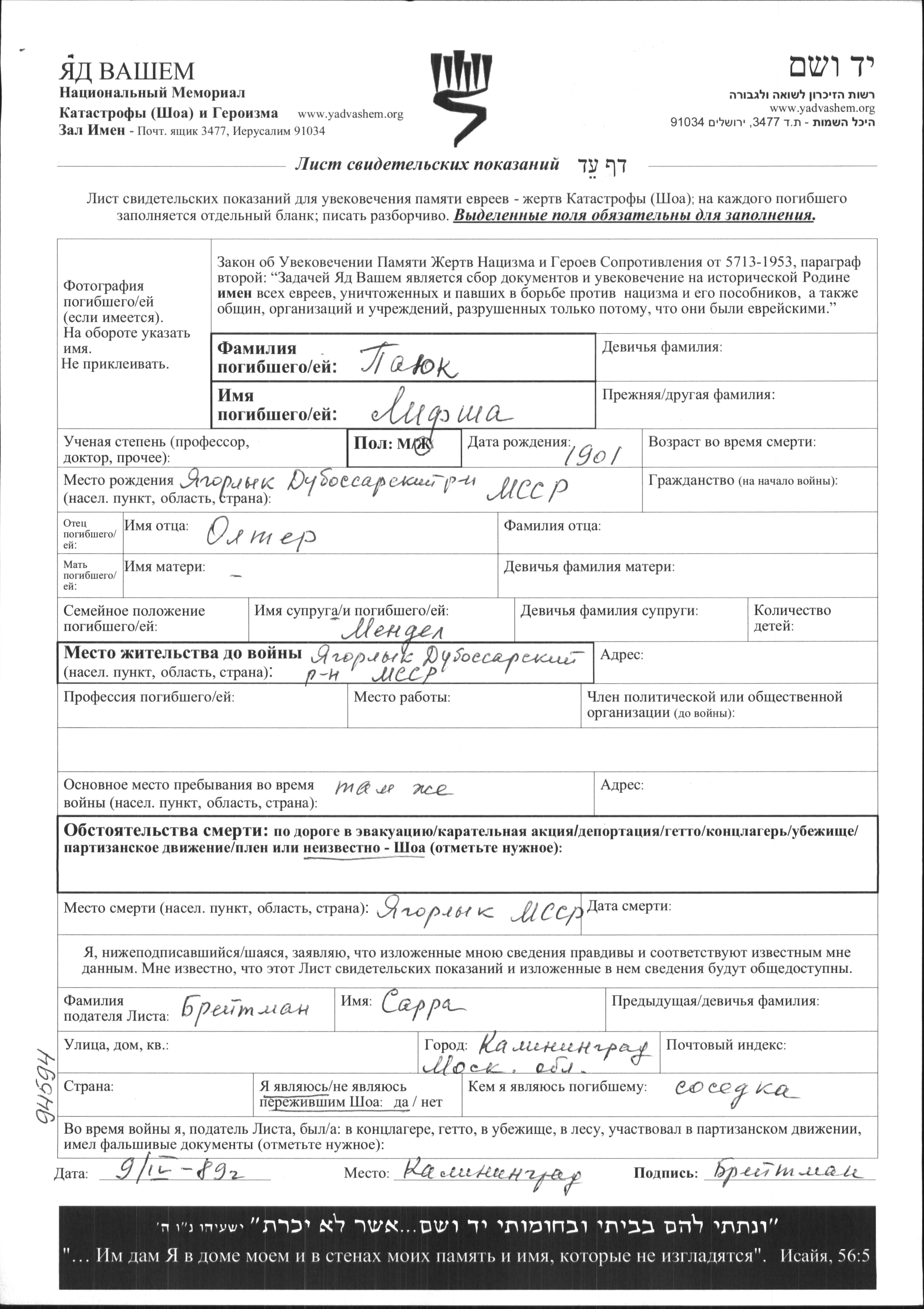 Lifsha Payuk was born in Yagorlyk, Ukraine (USSR), 1901 to Olter. She was married to Mendel. Prior to WWII she lived in Yagorlyk, Ukraine (USSR). During the war she was in Yagorlyk, Ukraine (USSR). Lifsha was murdered in the Shoah. Place of death: Yagorlyk, Ukraine (USSR).