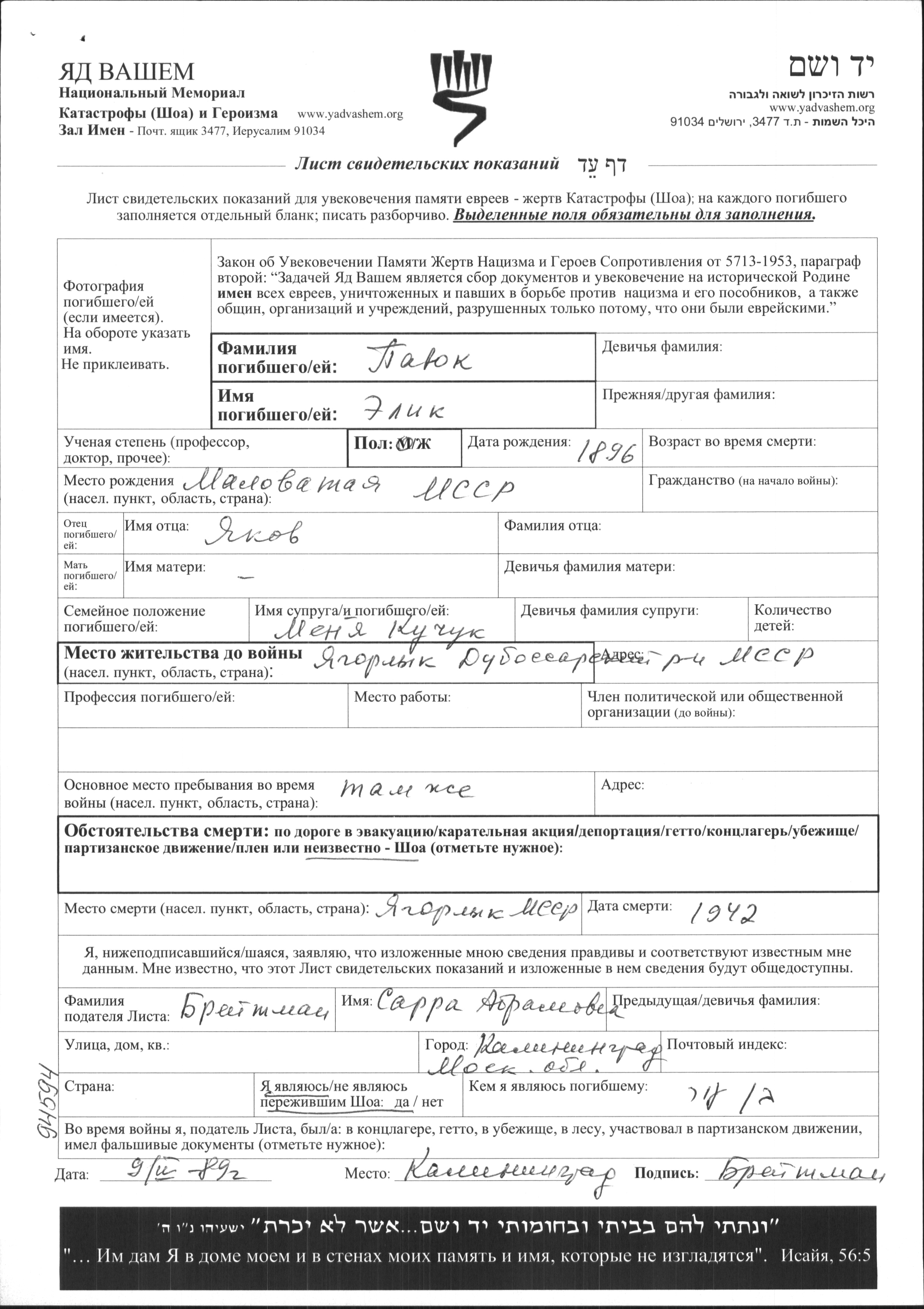 Elik Payuk was born in Malovata, Romania, 1896 to Yakov. He was married to Menya nee Kuchuk. Prior to WWII he lived in Yagorlyk, Ukraine (USSR). During the war he was in Yagorlyk, Ukraine (USSR). Elik was murdered in the Shoah. Place of death: Yagorlyk, Ukraine (USSR), 1942.