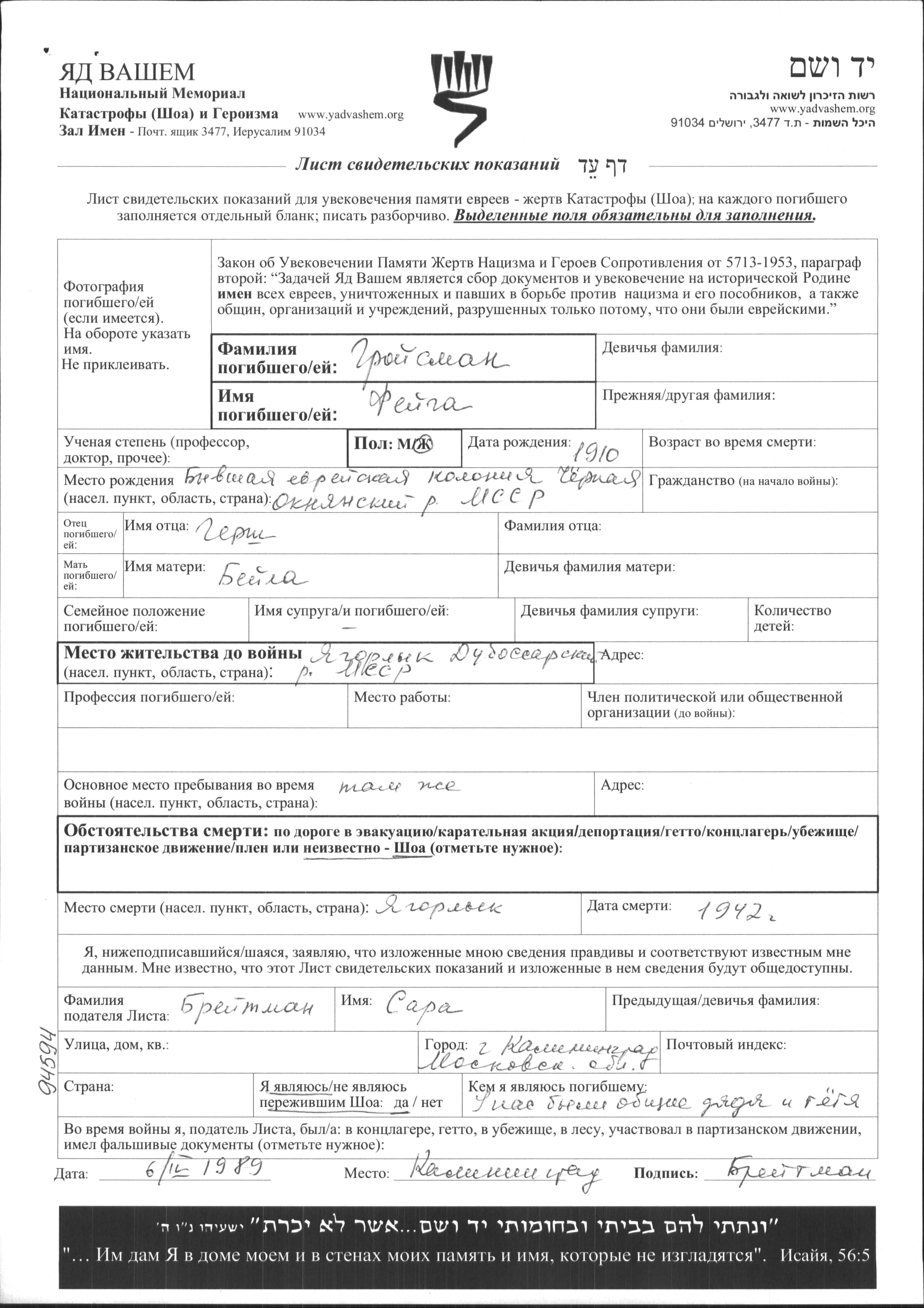 Feiga Groisman was born in Bessarabia, Moldova, 1910 to Gersh and Beila. Prior to WWII she lived in Yagorlyk, Ukraine (USSR). During the war she was in Yagorlyk, Ukraine (USSR). Feiga was murdered in the Shoah. Place of death: Yagorlyk, Ukraine (USSR), 1942.
