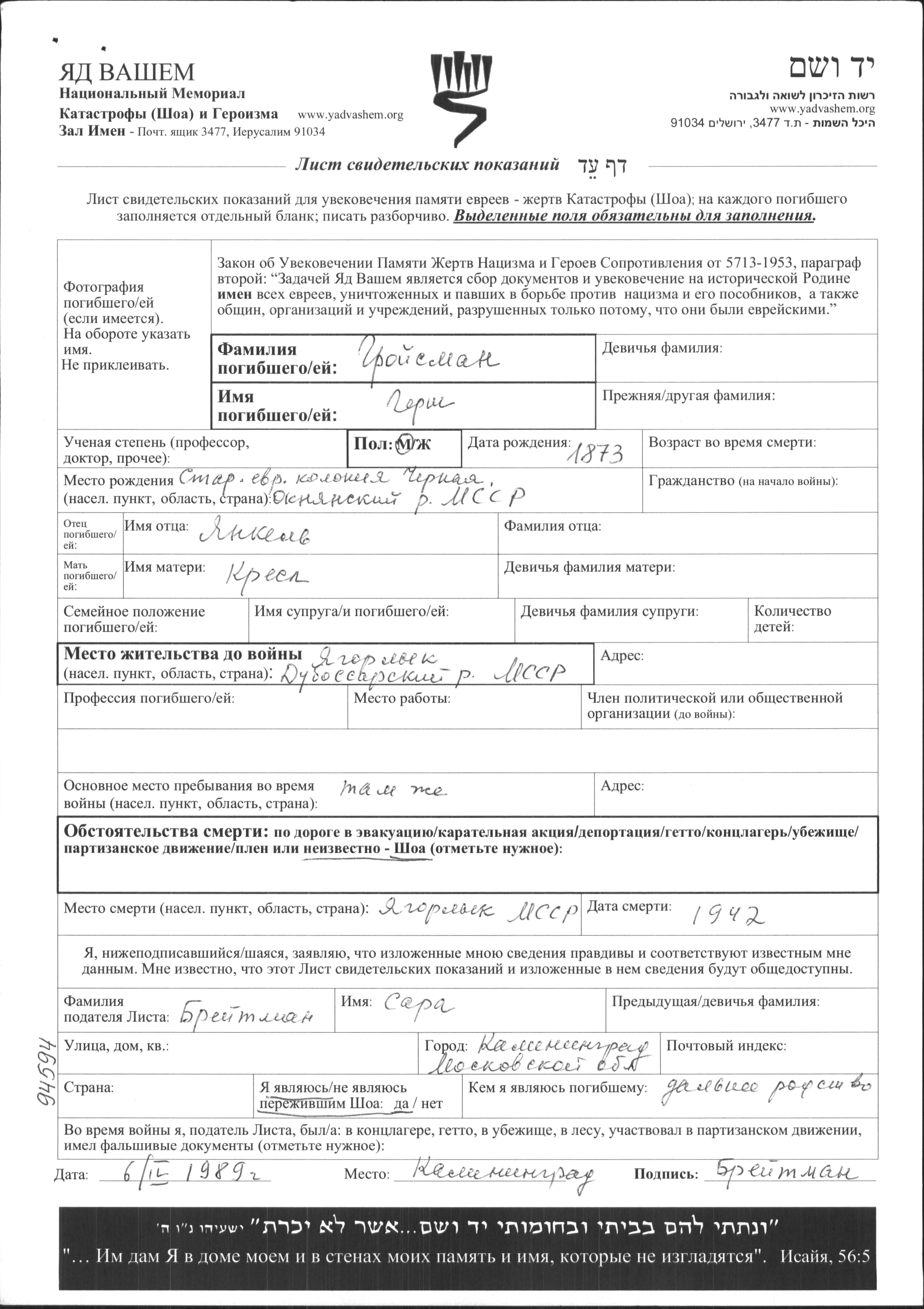 Gersh Groisman was born in Chernaya, Ukraine (USSR), 1873 to Yankel and Kresl. Prior to WWII he lived in Yagorlyk, Ukraine (USSR). During the war he was in Yagorlyk, Ukraine (USSR). Gersh was murdered in the Shoah. Place of death: Yagorlyk, Ukraine (USSR), 1942.