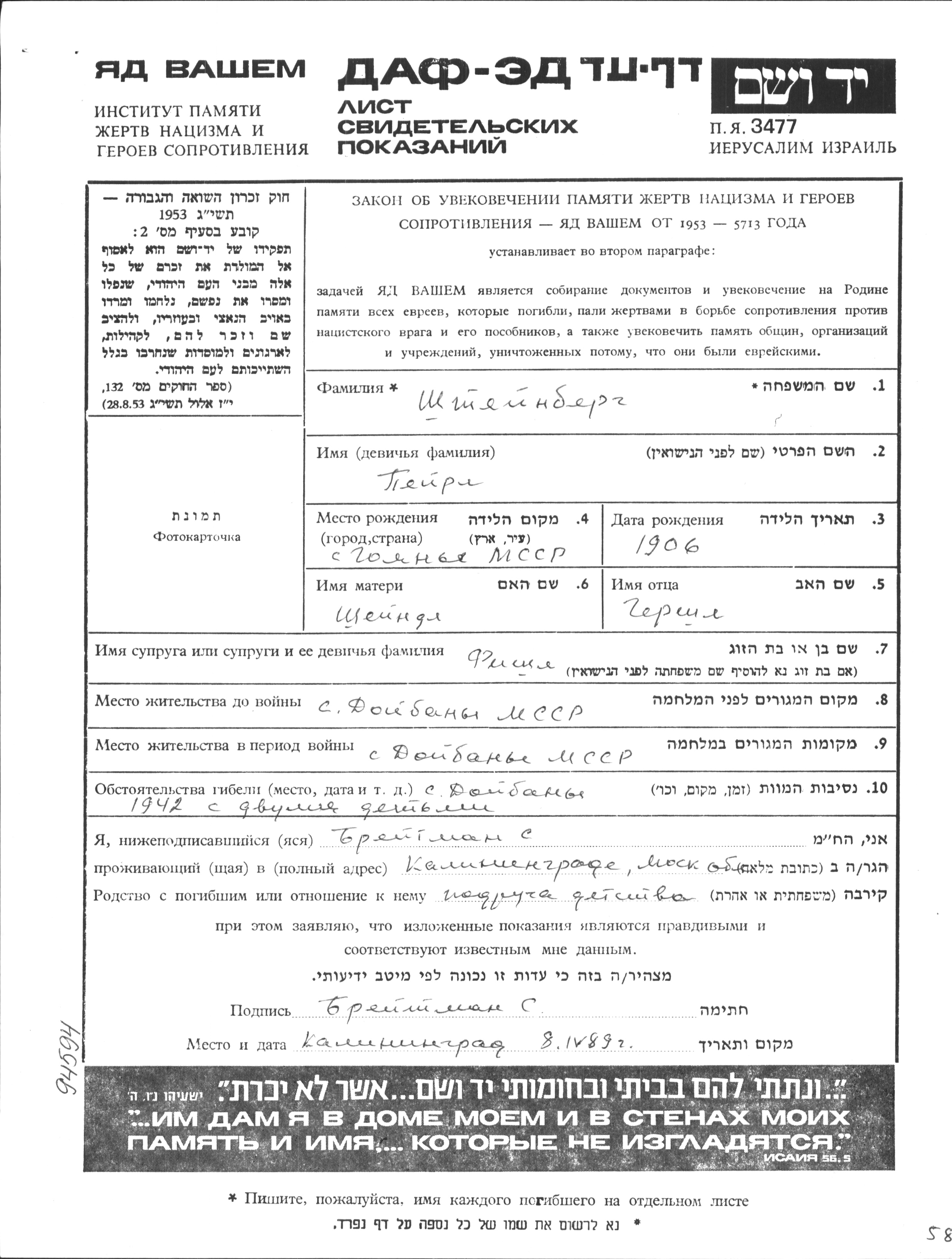 Peirl Shteinberg was born in Goyany, Ukraine (USSR), 1906 to Gershl and Sheindl. She was married to Fishl. Prior to WWII she lived in Doybany, Ukraine (USSR). During the war she was in Doybany, Ukraine (USSR). Peirl was murdered in the Shoah. Place of death: Doybany, Ukraine (USSR), 1942.