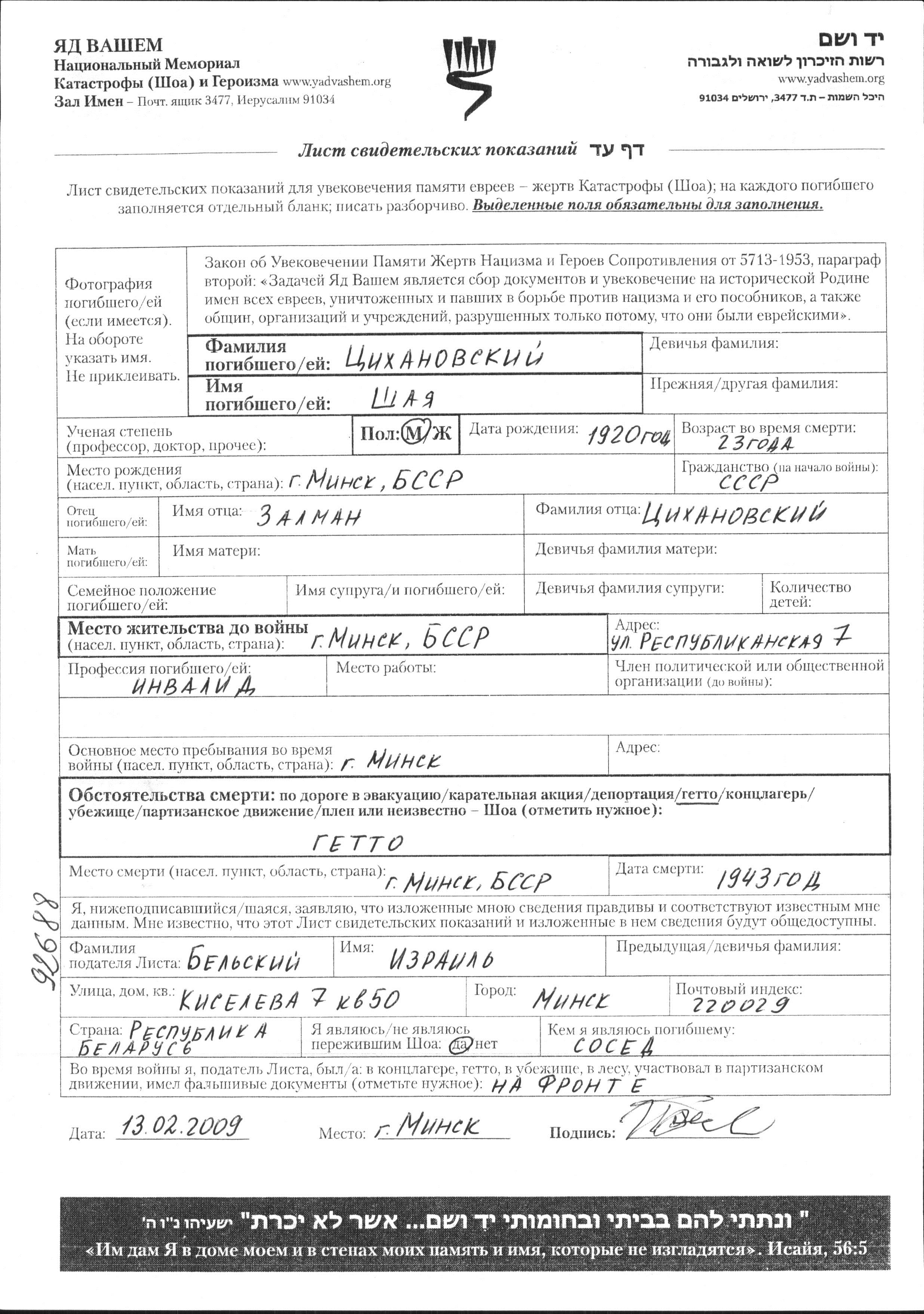 Tzikhanovski Shaya 1920 Minsk, Belorussia (USSR) Page of Testimony