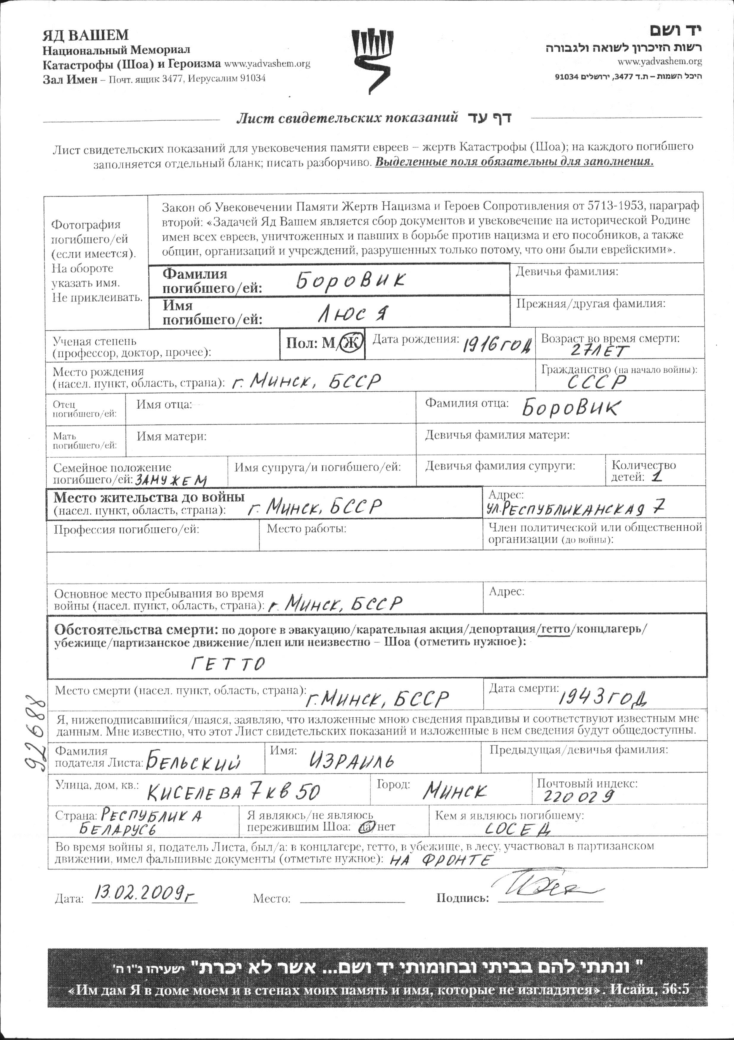 Borovik Lyusya 1916 Minsk, Belorussia (USSR) Page of Testimony