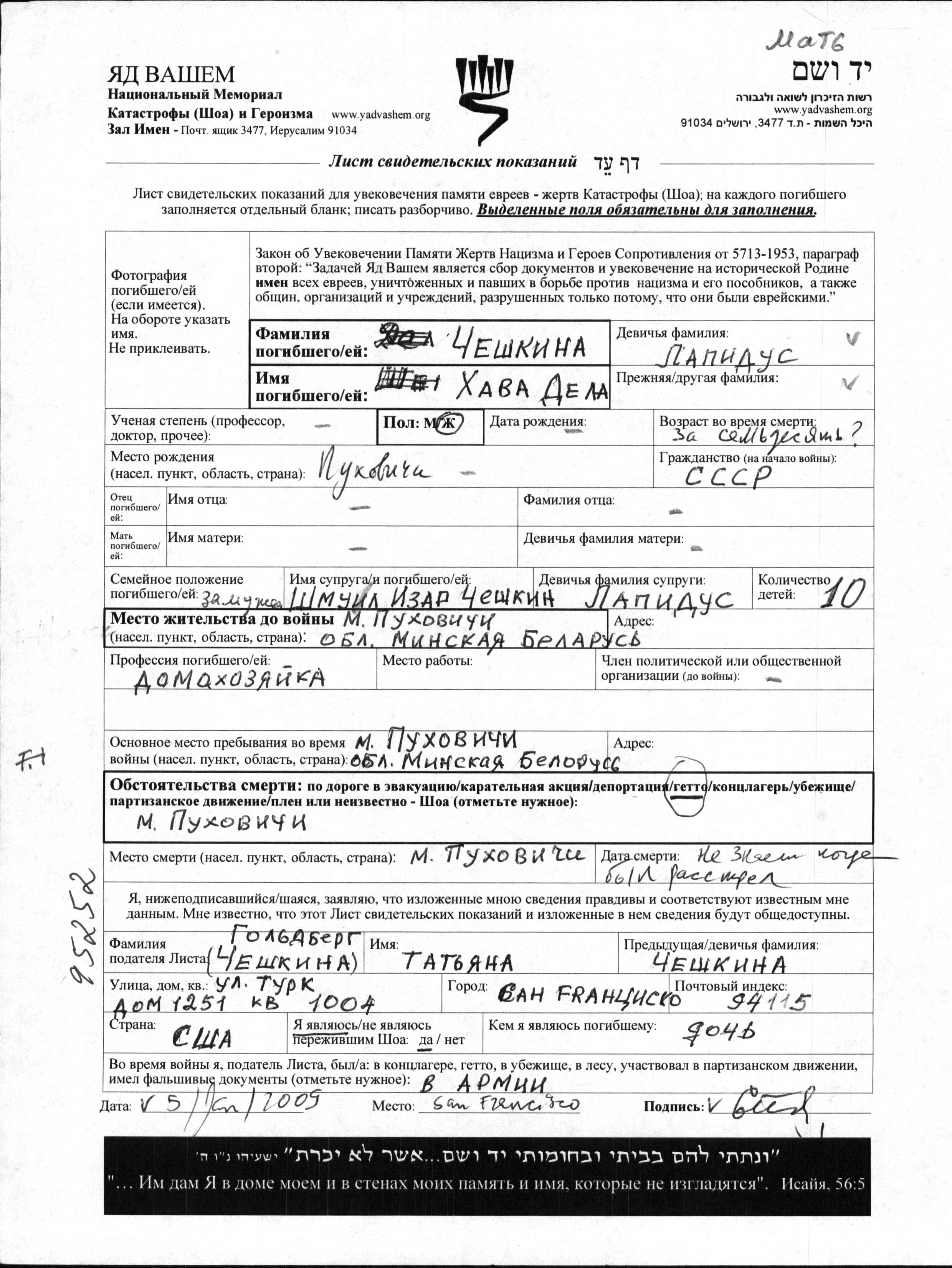 Cheshkina Khava Dela Pukhovichi, Belorussia (USSR) Page of Testimony
