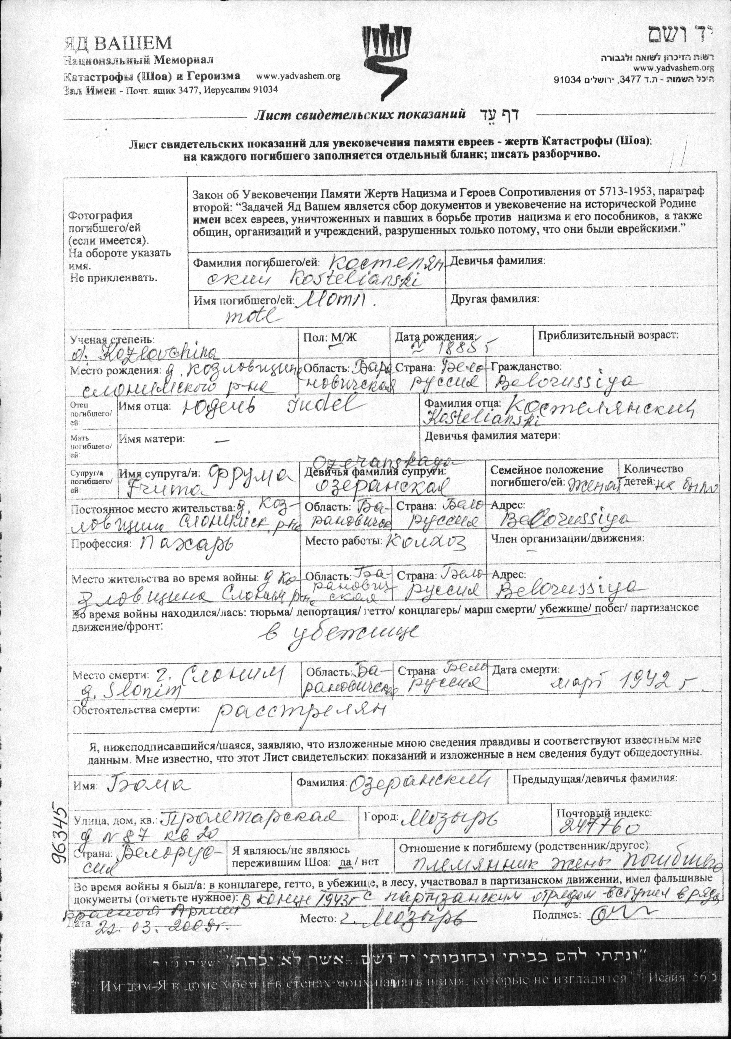 Motl Kostelyanski was born in Kozlovshchina, Poland, 1885 to Yudel. He was a zemlepashetz and married to Fruma nee Ozeranskaya. Prior to WWII he lived in Kozlovshchina, Poland. During the war he was in Kozlovshchina, Poland. Motl was murdered in the Shoah. Place of death: Slonim, Poland, 03/1942.