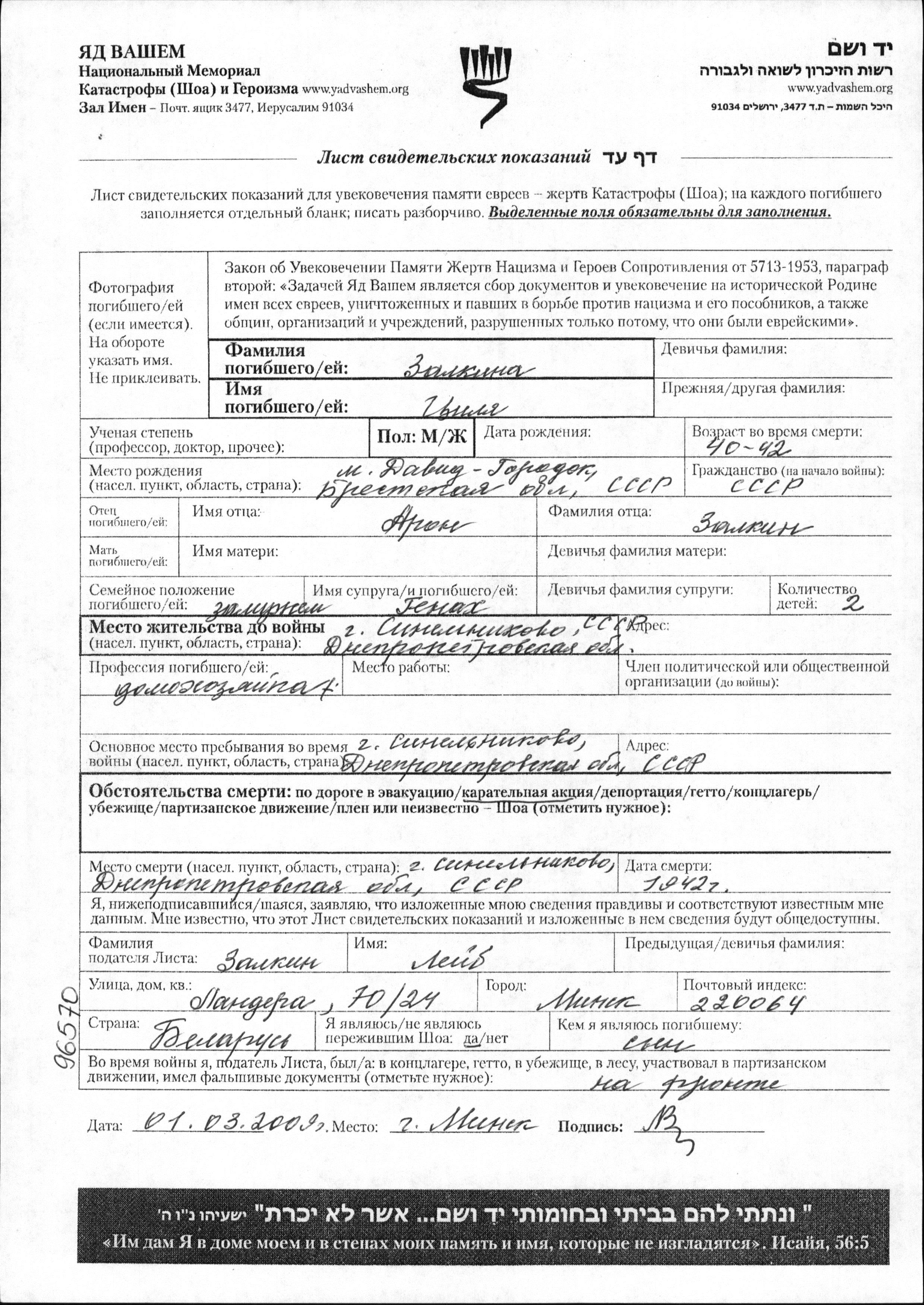 Zalkina Tzilya Sinelnikovo, Ukraine (USSR) Page of Testimony