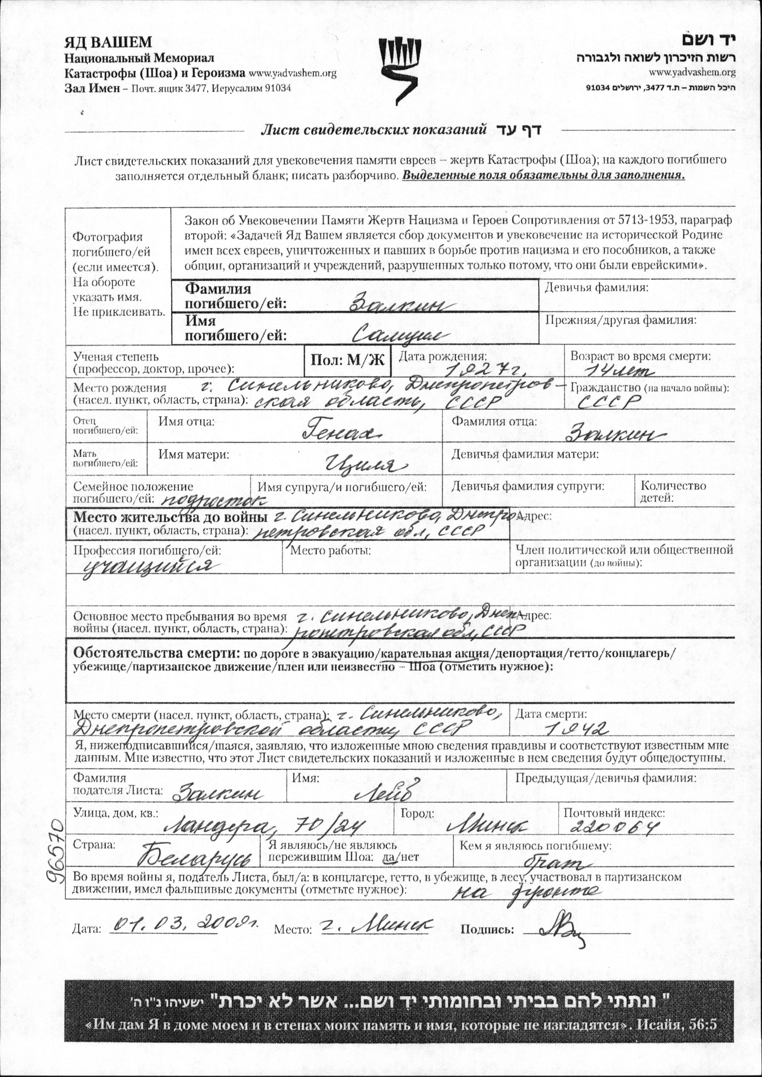 Samuil was murdered in the Shoah. Place of death: Sinelnikovo, Ukraine (USSR), 1942.