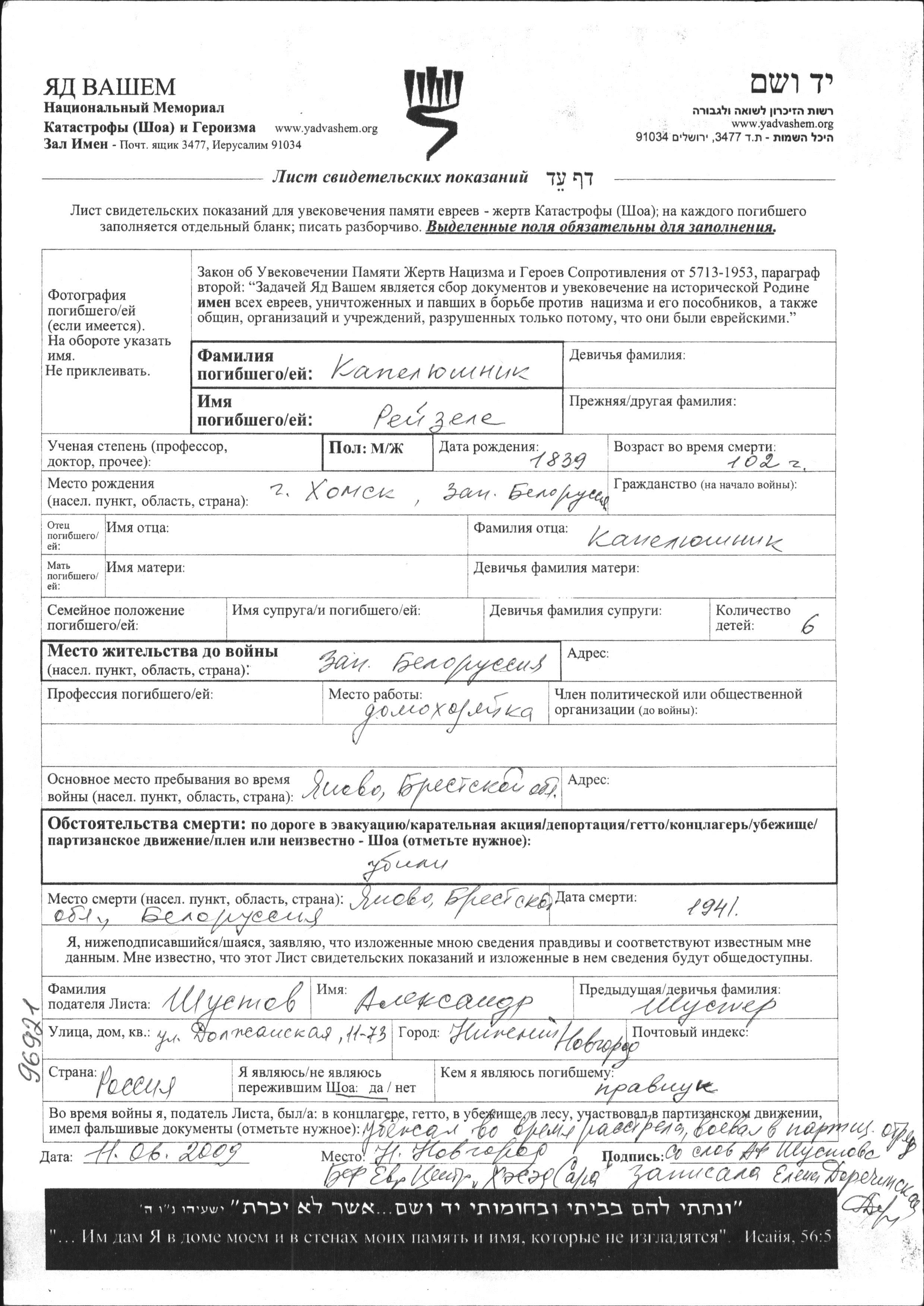 Reyzele Kapelyushnik was born in Khomsk, Poland. She was a housewife and married. Prior to WWII she lived in Polesie, Poland. During the war she was in Janowo, Poland. Reyzele was murdered in the Shoah. Place of death: Janowo, Poland, 1941.