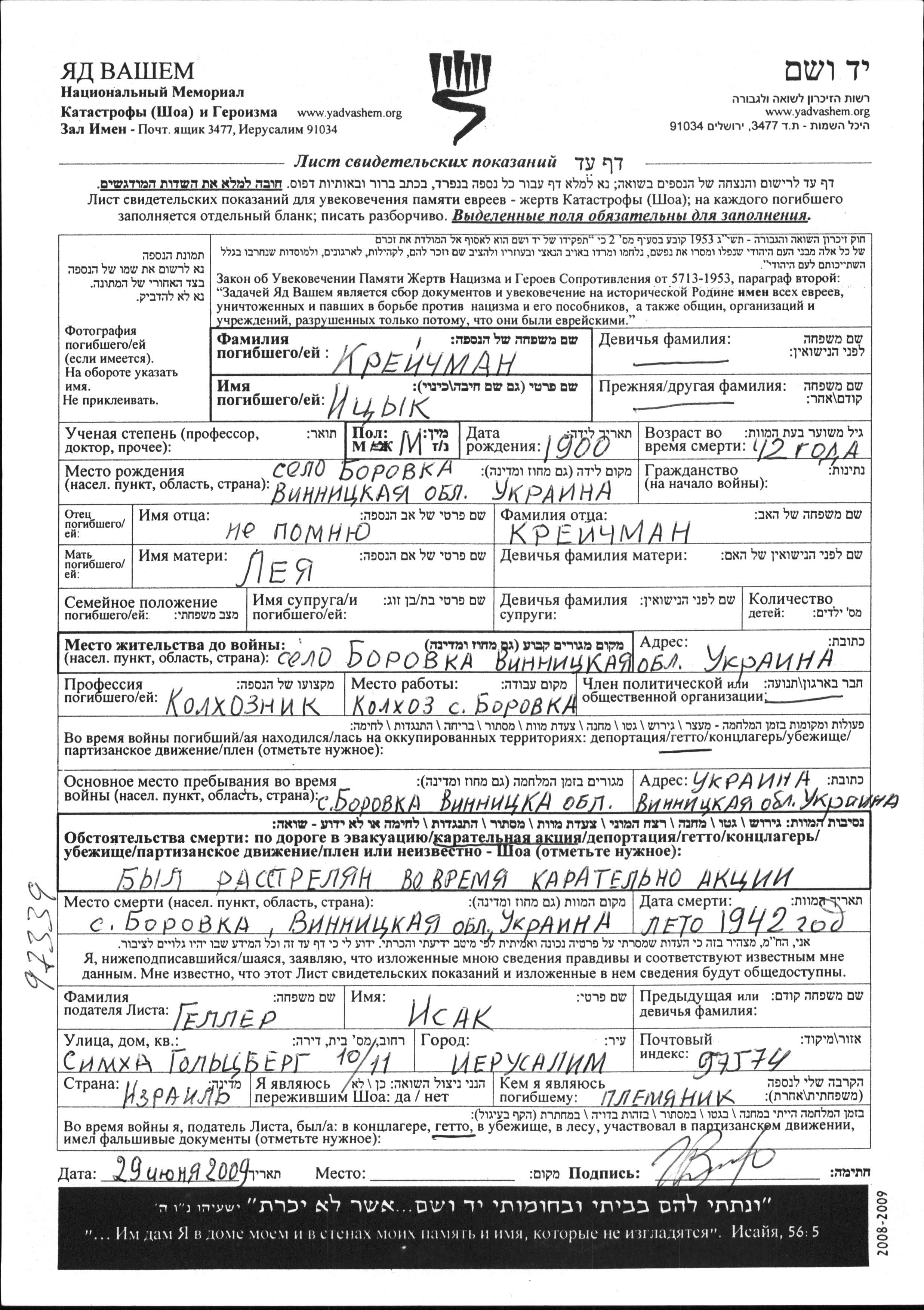 Itzyk Kreychman was born in Borovka, Ukraine (USSR), 1900 to Lea. He was a kolkhoznik / kolkhoznitza. Prior to WWII he lived in Borovka, Ukraine (USSR). During the war he was in Ghetto. Itzyk was murdered in the Shoah. Place of death: Borovka, Ukraine (USSR), 07/1942.