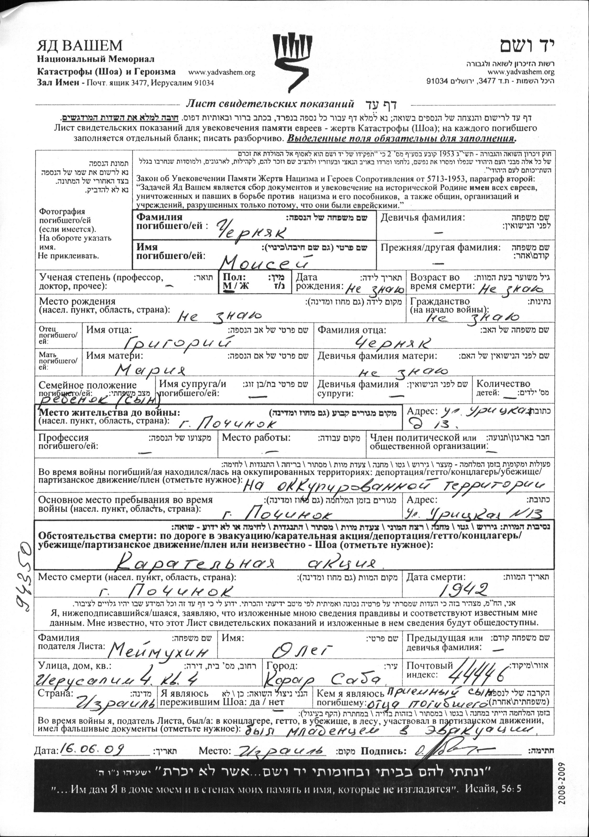 Moisei Chernyak was born to Grigori and Mariya. He was child. Prior to WWII he lived in Pochinok, Russia (USSR). During the war he was in Pochinok, Russia (USSR). Moisei was murdered in the Shoah. Place of death: Pochinok, Russia (USSR), 1942.