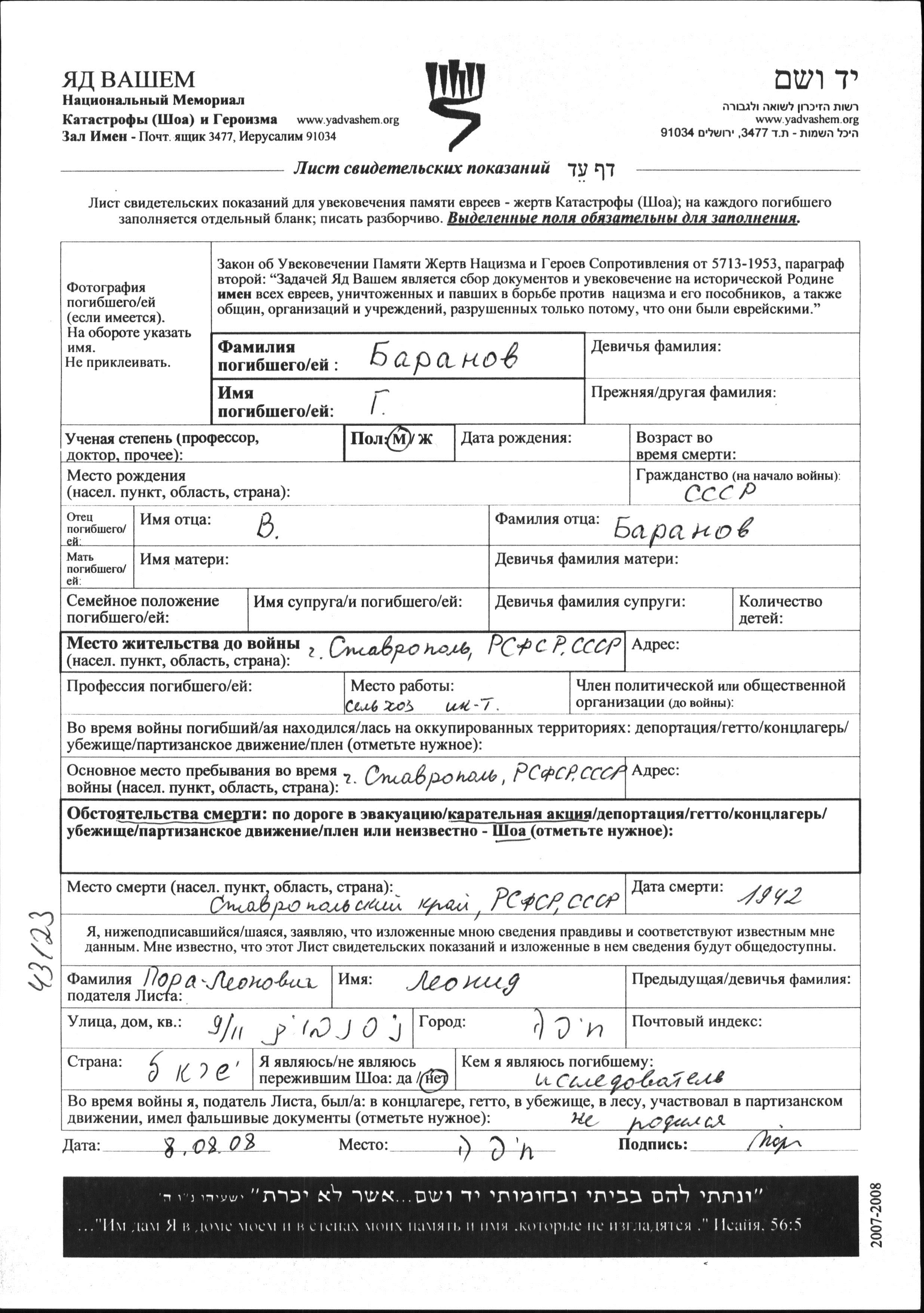 Baranov G Stavropol, Russia (USSR) Page of Testimony