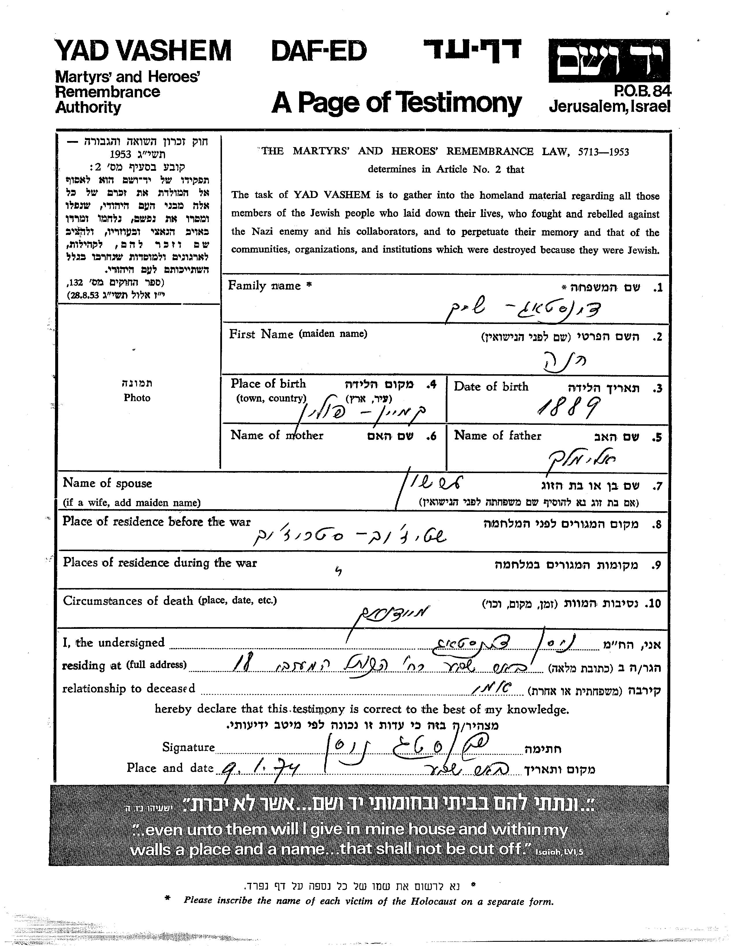 Khana Dinstag nee Shikh was born in Kamien, Poland, 1889 to Elimelekh. She was married to Gershon. Prior to WWII she lived in Strizev, Poland. During the war she was in Strizev, Poland. Khana was murdered in the Shoah. Place of death: Majdanek, Poland.