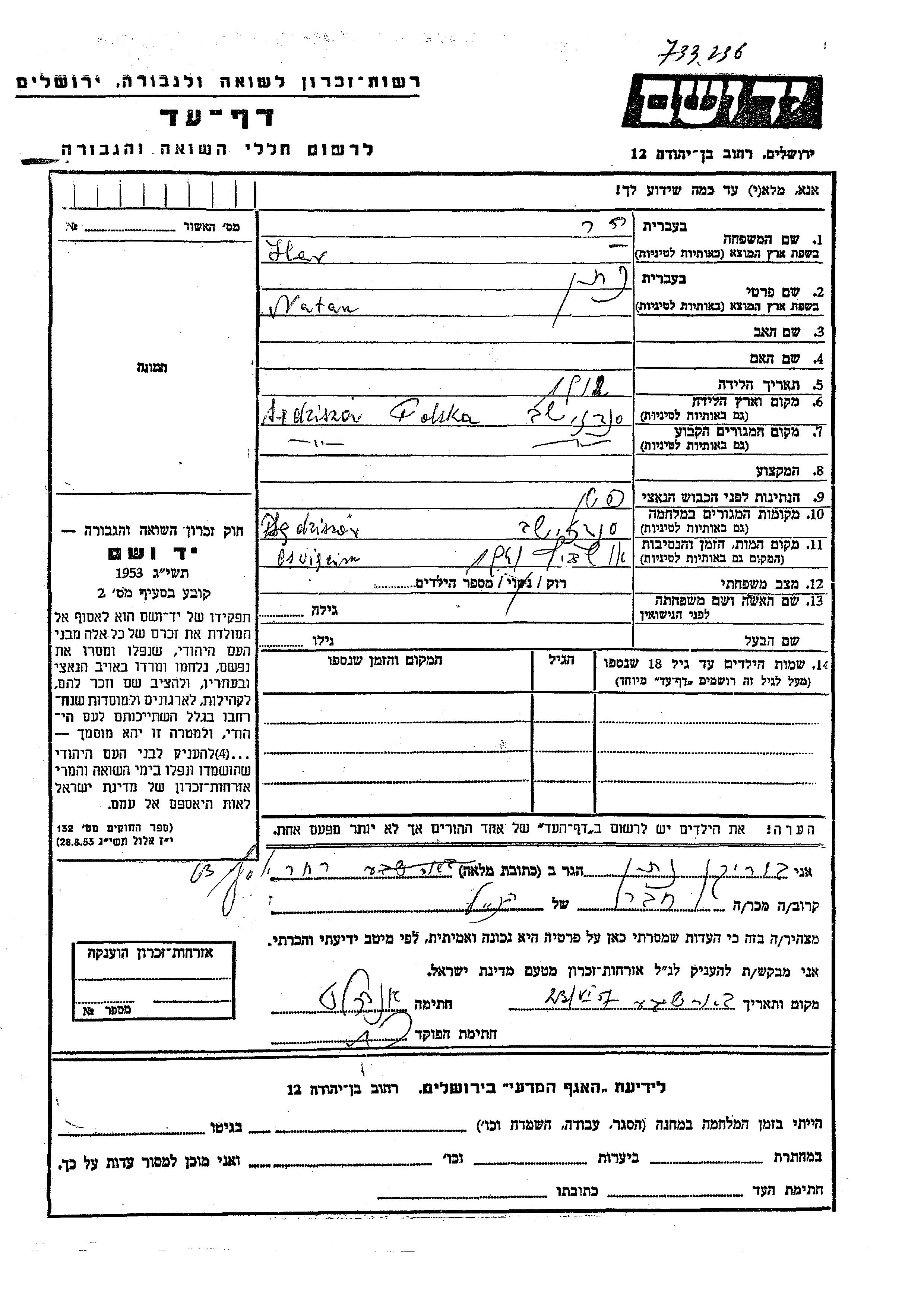 Natan Har was born in Sedziszow Malopolski, Poland, 1912. He was single. Prior to WWII he lived in Sedziszow Malopolski, Poland. During the war he was in Sedziszow Malopolski, Poland. Natan was murdered in the Shoah. Place of death: Auschwitz, Poland, 1941.