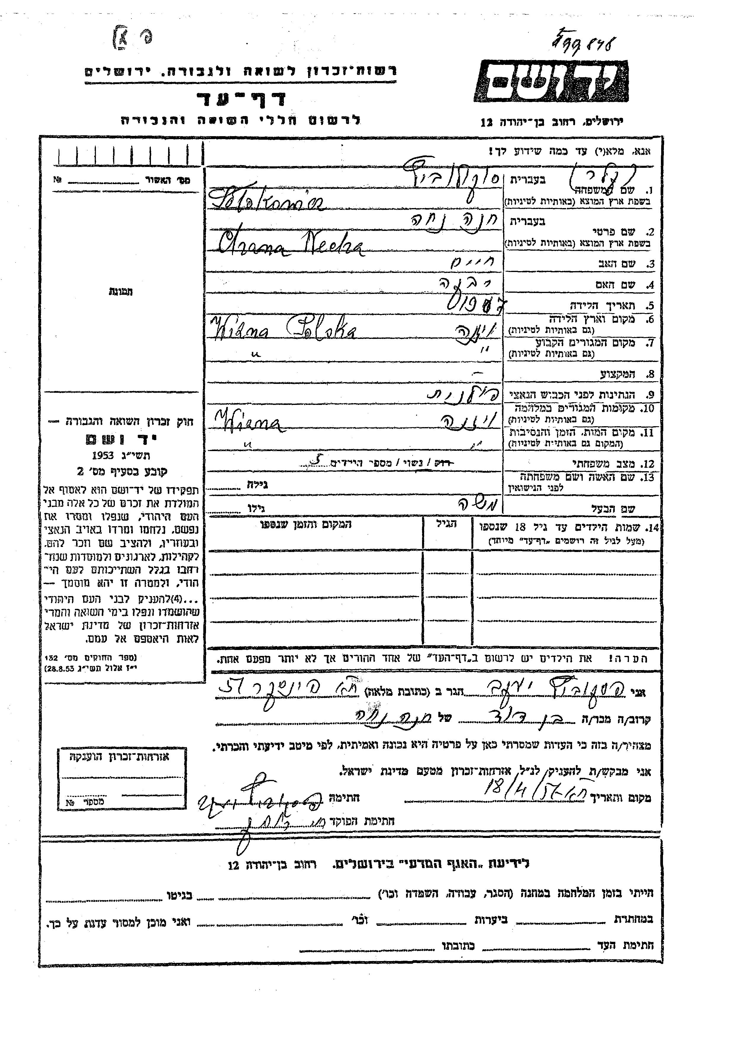 Chana Necha Sokolowicz nee Keler was born in Wizna, Poland, 1907 to Khaim and Rivka. She was married to Moshe. Prior to WWII she lived in Wizna, Poland. During the war she was in Wizna, Poland. Chana Necha was murdered in the Shoah. Place of death: Wizna, Poland.
