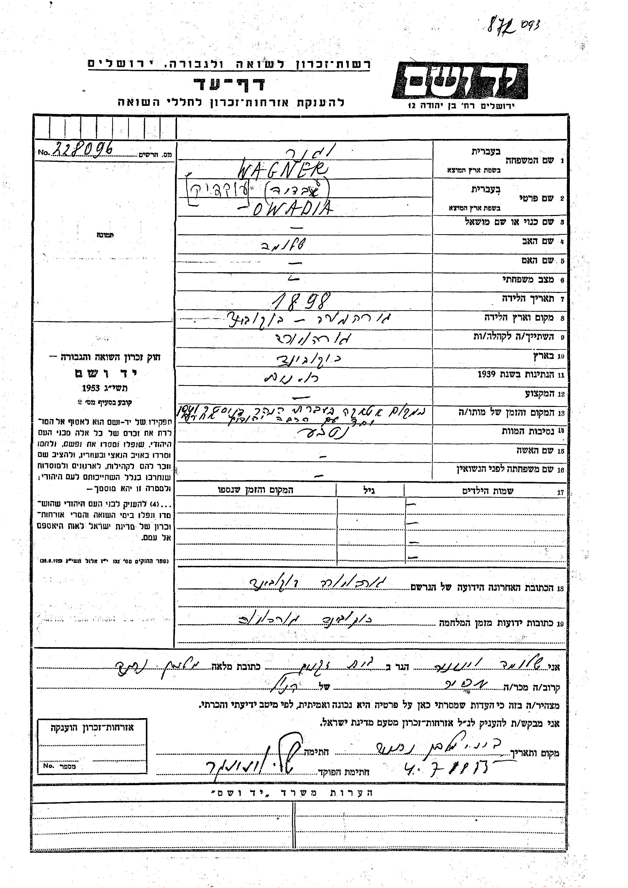 Owadia Wagner was born in Gura Humora, Romania, 1898 to Shlomo. Prior to WWII he lived in Gura Humora, Romania. During the war he was in Gura Humora, Romania. Owadia was murdered in the Shoah. Place of death: Ataki, Romania, 1941.