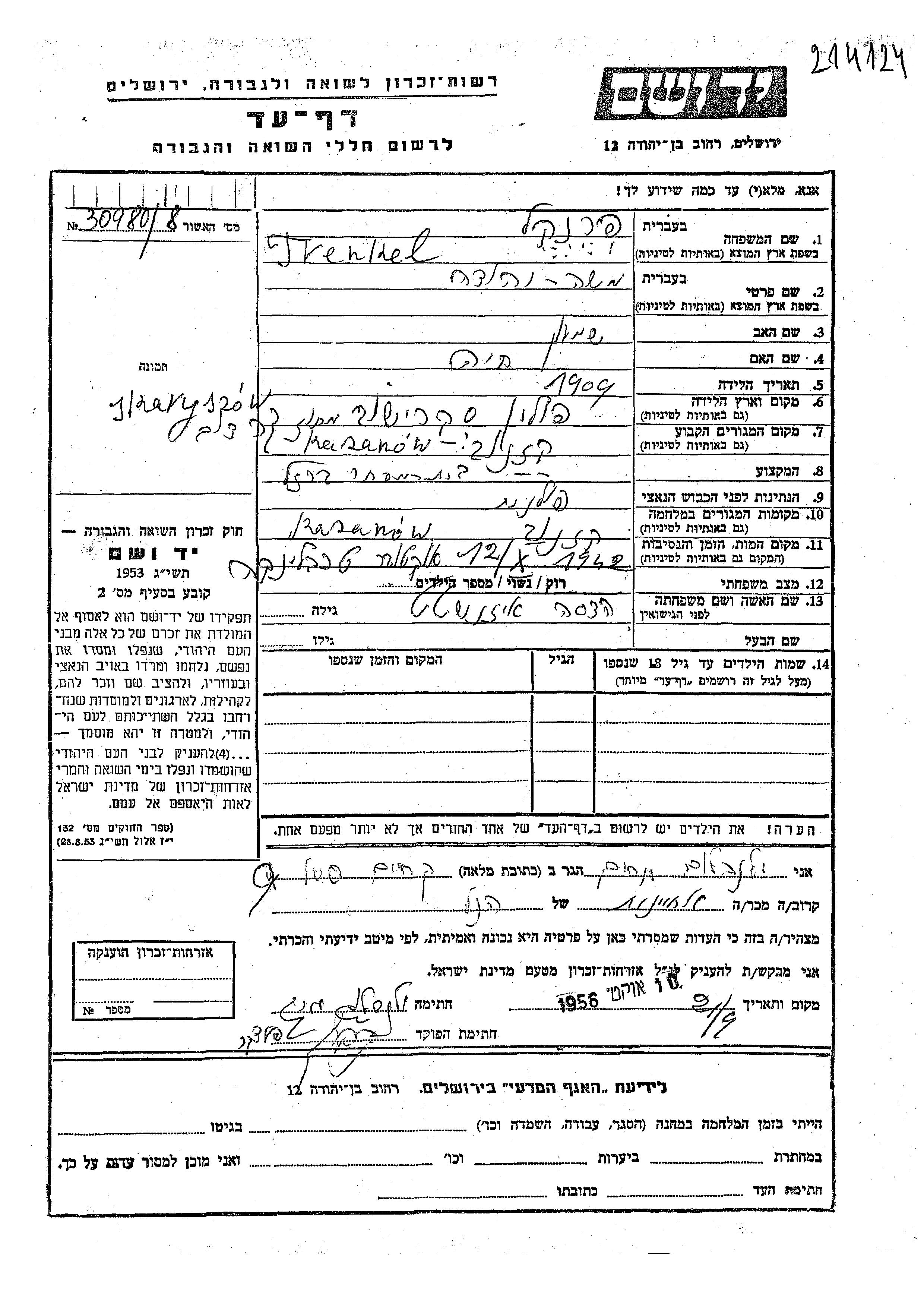 Moshe Yehuda Frenkel was born in Skaryszew, Poland, 1909 to Shimon and Khaia. He was married to Hadasa nee Eizenshtat. Prior to WWII he lived in Kazanow, Poland. During the war he was in Kazanow, Poland. Moshe Yehuda was murdered in the Shoah. Place of death: Treblinka, Poland, 12/10/1942.