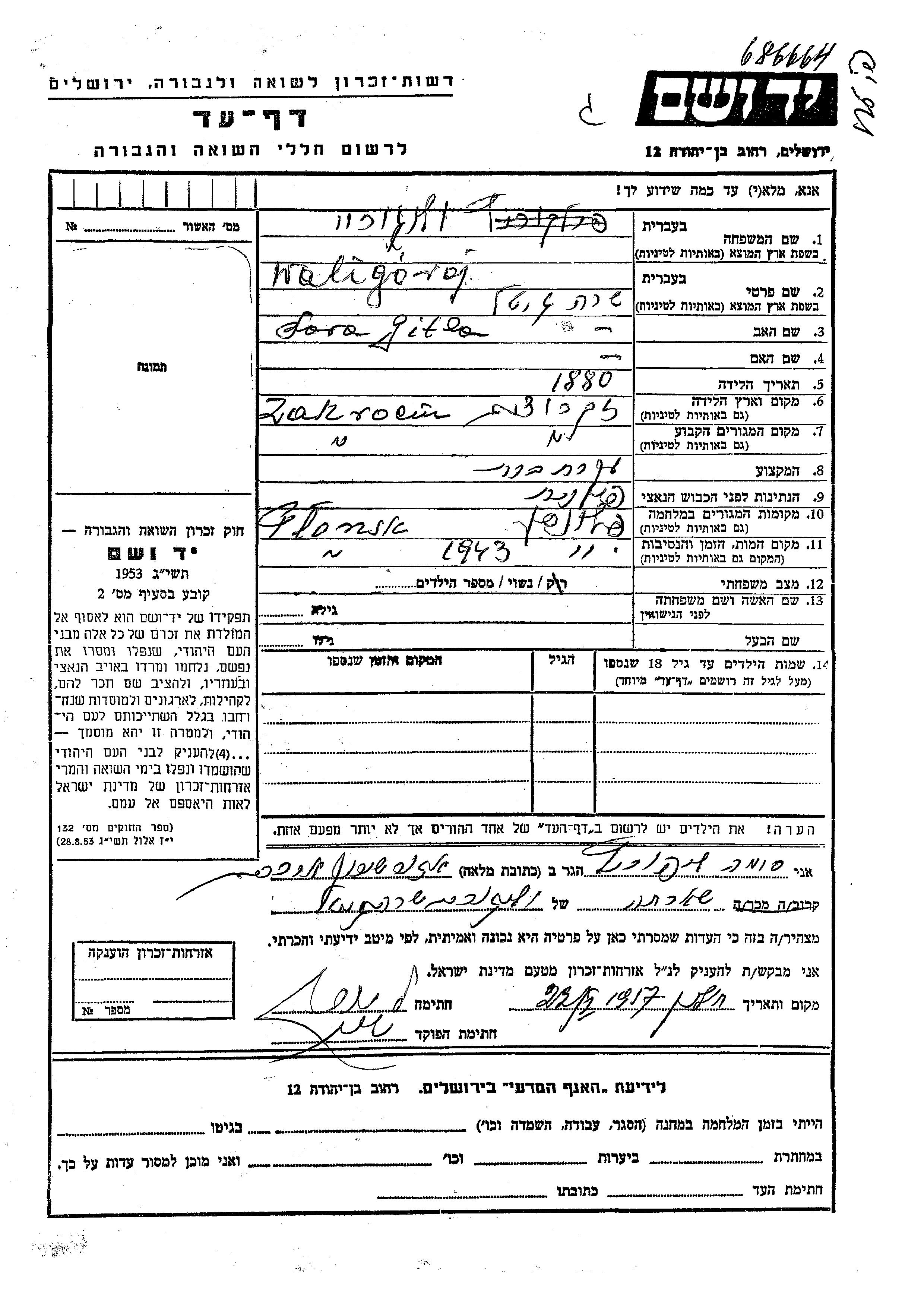 Gitla Sara Waligoroj was born in Zakroczym, Poland, 1880. She was a housewife and married. Prior to WWII she lived in Zakroczym, Poland. During the war she was in Plonsk, Poland. Gitla Sara was murdered in the Shoah. Place of death: Plonsk, Poland, 1943.