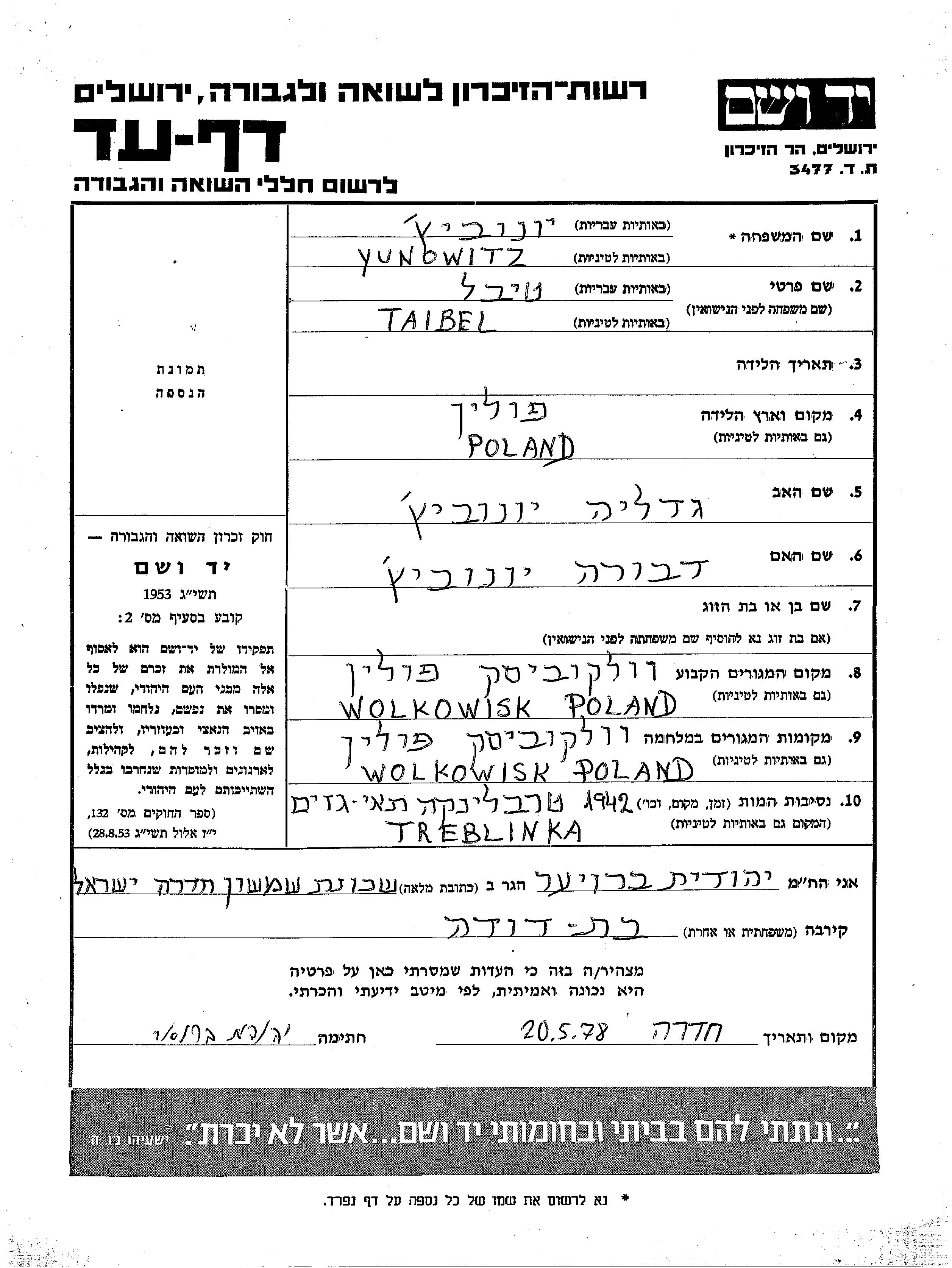 Junowitz Taibel Tibel Wolkowisk, Poland Page of Testimony