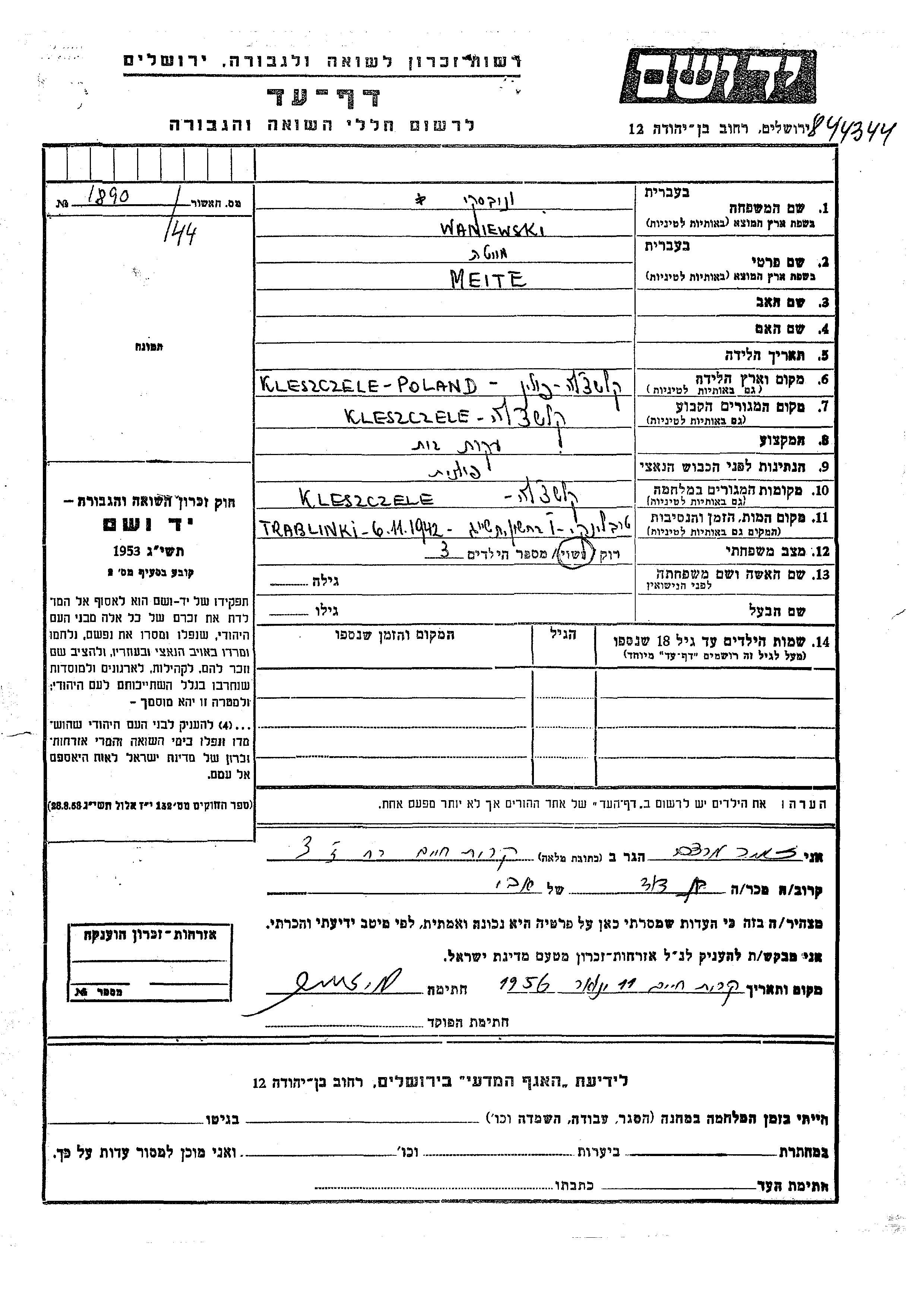 Meite Waniewski was born in Kleszczele, Poland. She was a housewife and married. Prior to WWII she lived in Kleszczele, Poland. During the war she was in Kleszczele, Poland. Meite was murdered in the Shoah. Place of death: Treblinka, Poland, 06/11/1942.