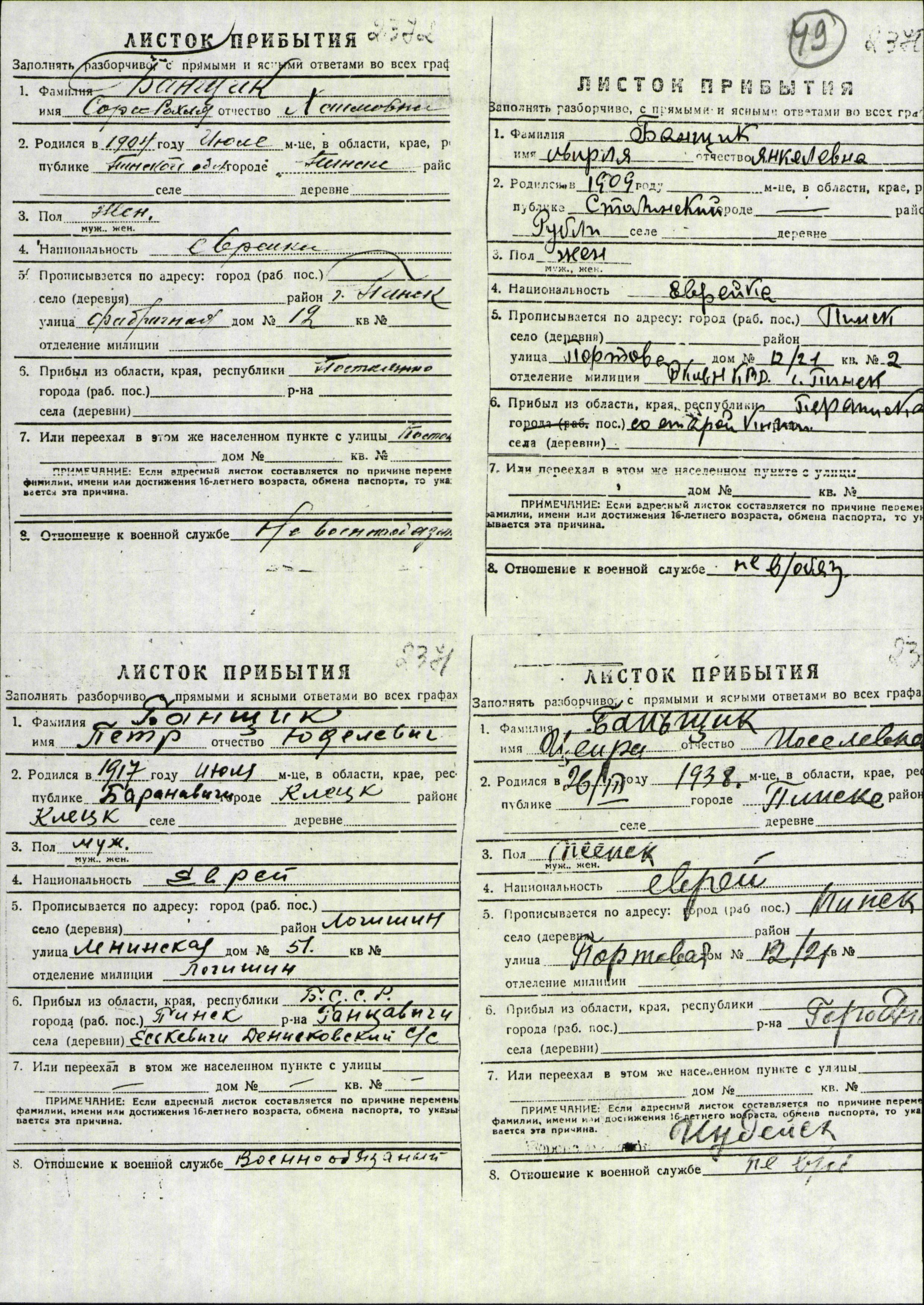 Tzeira Banshchik was born in Pinsk, Poland, 1938 to Iosel. Prior to WWII she lived in Gorodnoye, Poland.
