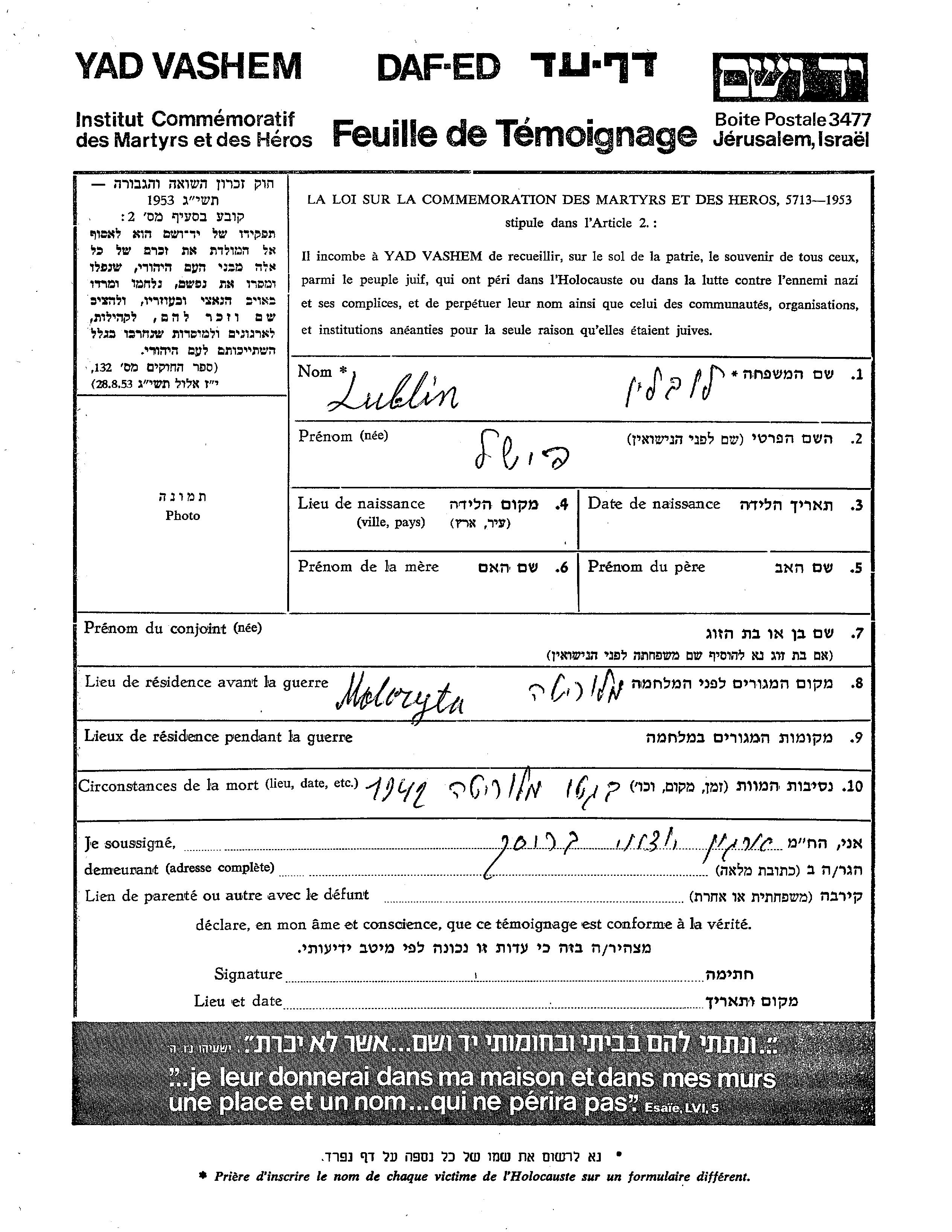 Lublin Fishel Maloryta, Poland Page of Testimony