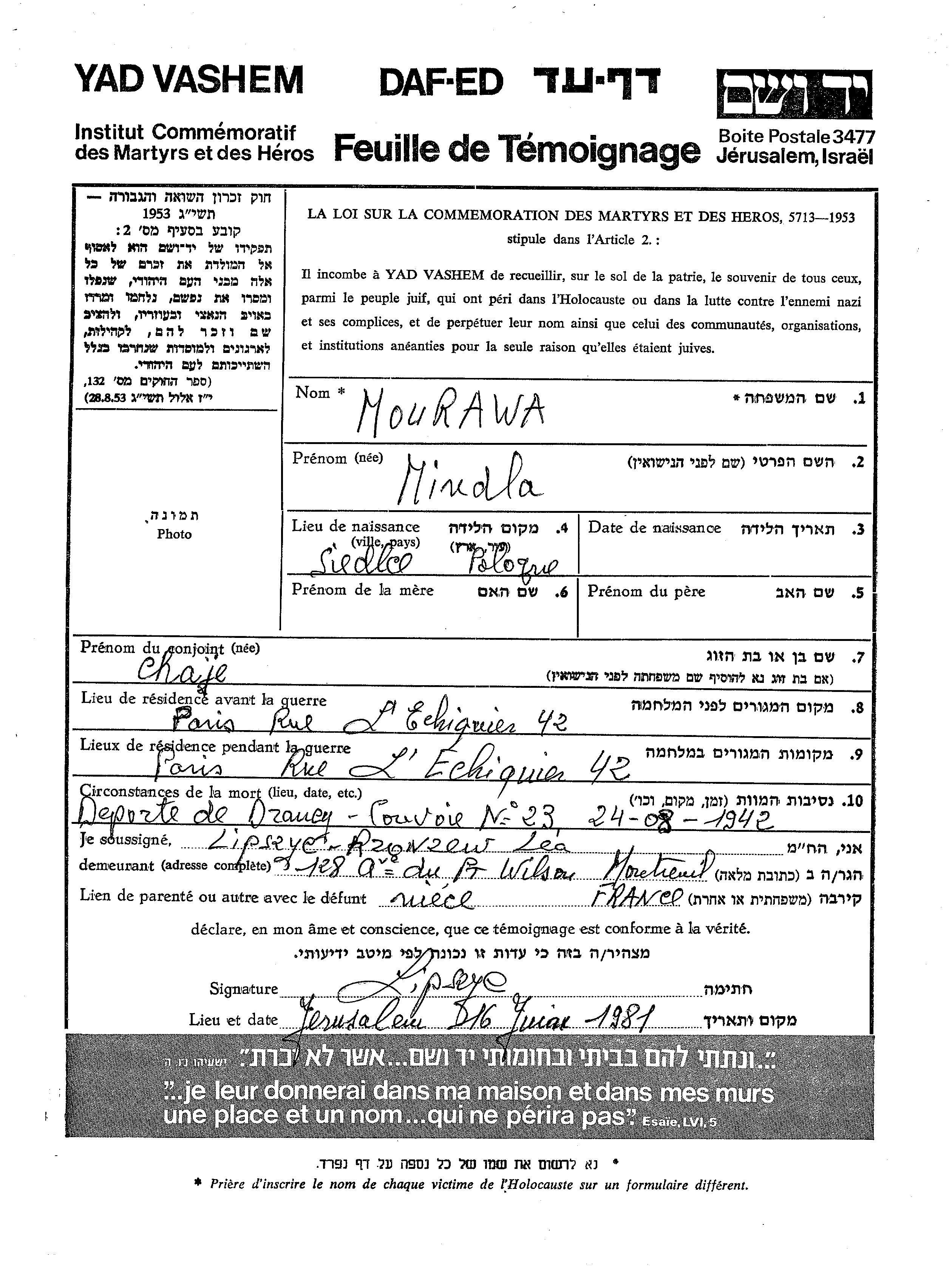 Mindla Mourawa was born in Siedlce, Poland. She was married to Chaja. Prior to WWII she lived in Paris, France. During the war she was in Paris, France. Mindla was murdered in the Shoah. Place of death: Drancy, France, 24/08/1942.