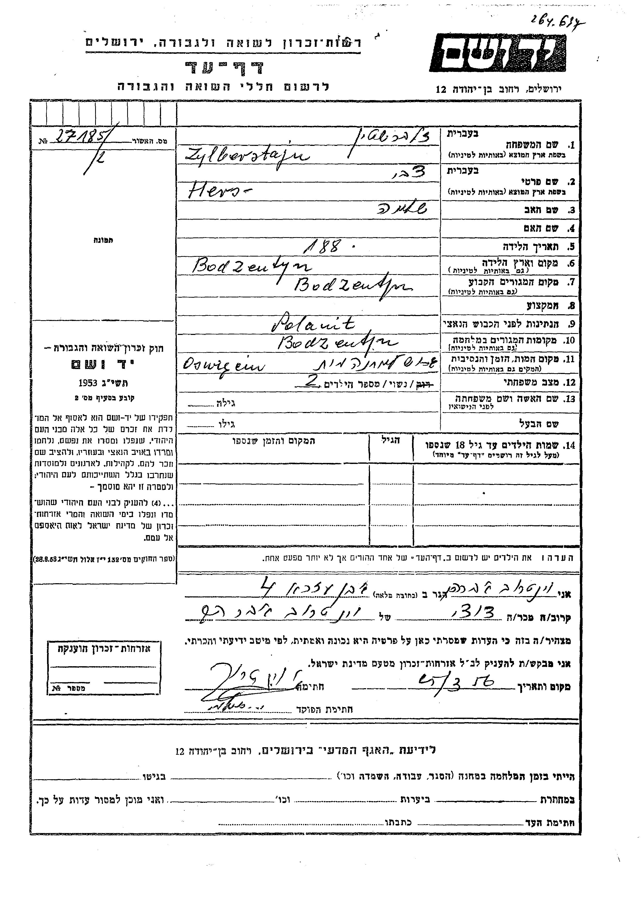 Hers Tzvi Zylberstajn was born in Bodzentyn, Poland, 1880 to Shlomo. He was married. Prior to WWII he lived in Bodzentyn, Poland. During the war he was in Bodzentyn, Poland. Hers Tzvi was murdered in the Shoah. Place of death: Auschwitz, Poland.
